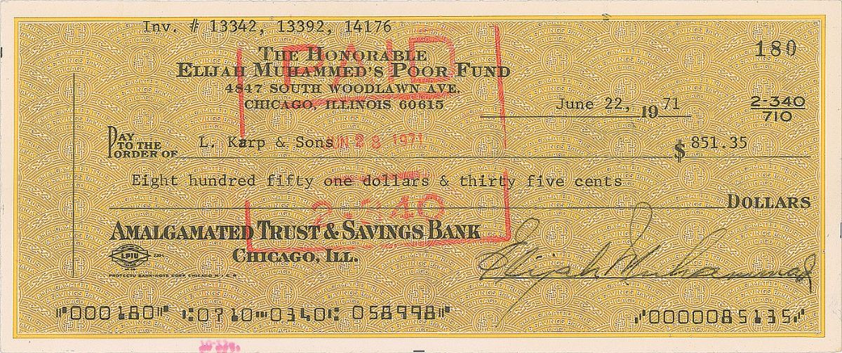 The Honorable Elijah Muhammed’s Poor Fund business check, 7.25 x 3, filled out in type and signed by Muhammad, payable to L. Karp & Sons for $851.35, June 22, 1971. In fine condition.