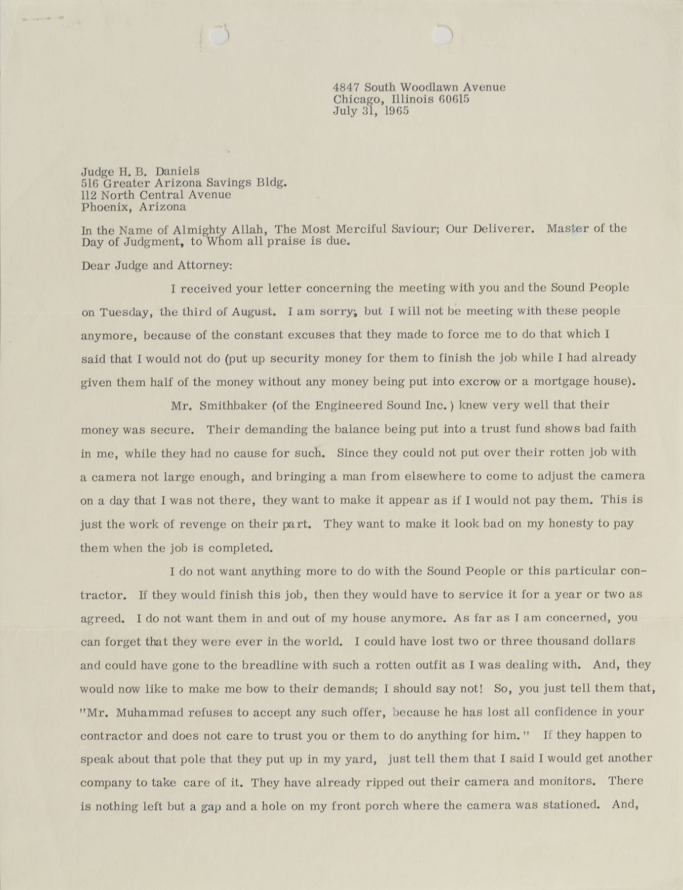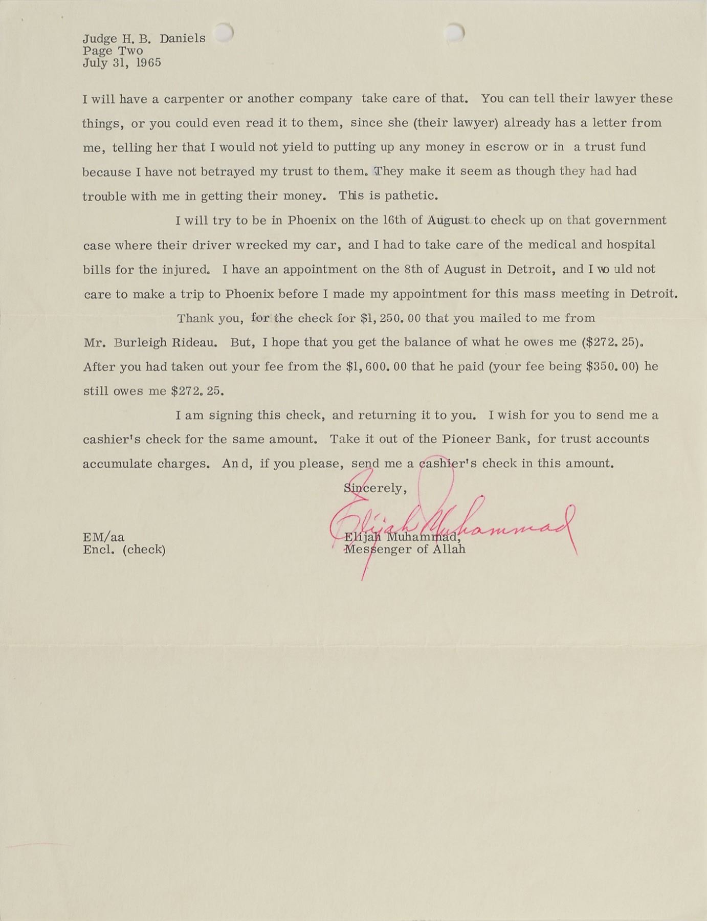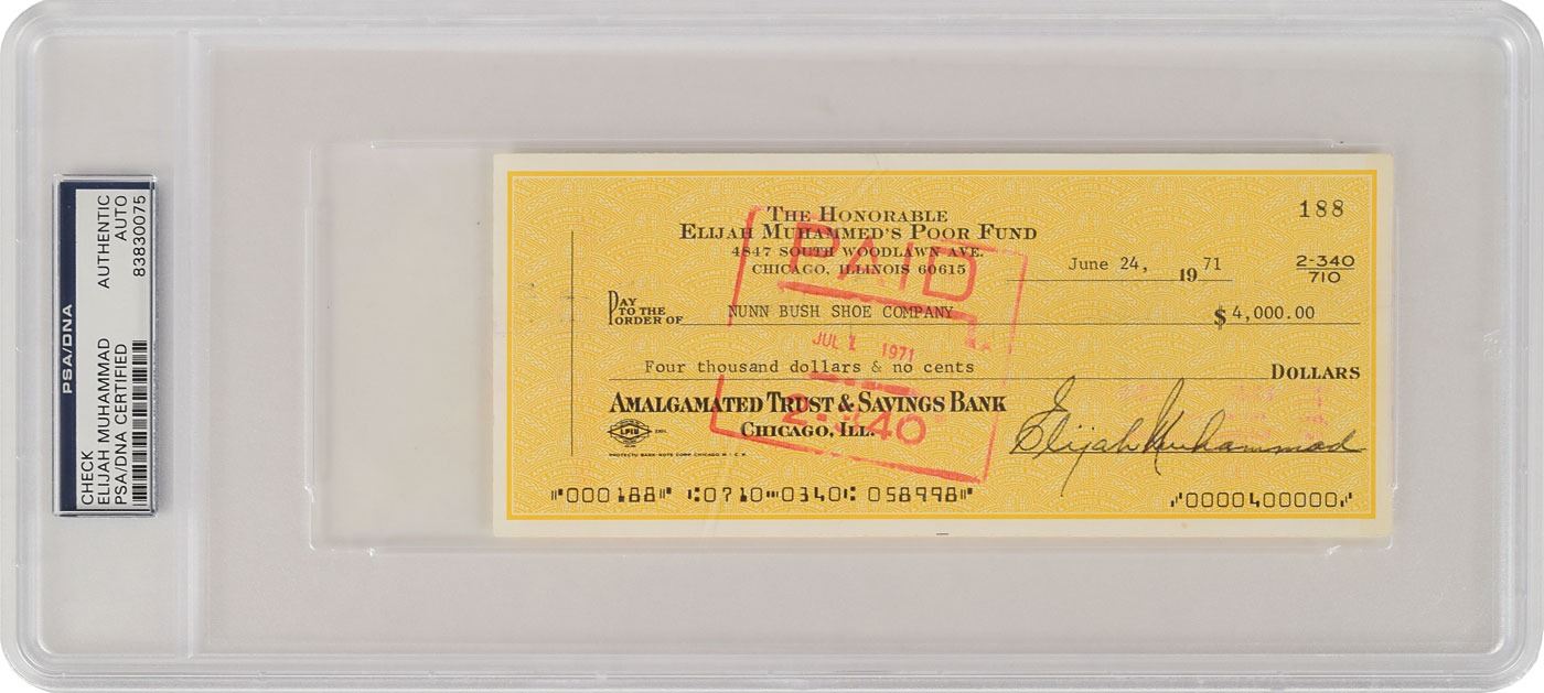 Two items: a TLS signed "Elijah Muhammad," two pages, 8.5 x 11, July 31, 1965, to Judge H. B. Daniels, in part: "In the Name of Almighty Allah, The Most Merciful Saviour; Our Deliverer. Master of the Day of Judgment, to Whom all praise is due. Dear Judge and Attorney: I received your letter concerning the meeting with your and the Sound People on Tuesday, the third of August. I am sorry, but I will not be meeting with these people anymore, because of the constant excuses that they made to force me to do that which I said that I would not do (put up security money for them to finish the job while I had already given them half of the money without any money being put into excrow or a mortgage house). Mr. Smithbaker (of the Engineered Sound Inc.) knew very well that their money was secure. Their demanding the balance being put into a trust fund shows bad faith in me, while they had no cause for such. Since they could not put over their rotten job with a camera not large enough, and bringing a man from elsewhere to come to adjust the camera on a day that I was not there, they want to make it appear as if I would not pay them. They want to make it look bad on my honesty to pay them when the job is completed. I do not want anything more to do with the Sound People or this particular contractor…As far as I am concerned, you can forget that they were ever in the world." Also includes a check from The Honorable Elijah Muhammed's Poor Fund, 7.25 x 3, filled out in type and signed by Muhammad, "Elijah Muhammad," payable to the Nunn Bush Shoe Company for $4,000, June 24, 1971. The check is encapsulated in a plastic PSA/DNA authentication holder. In overall fine condition. Accompanied by the original mailing envelope for the letter.