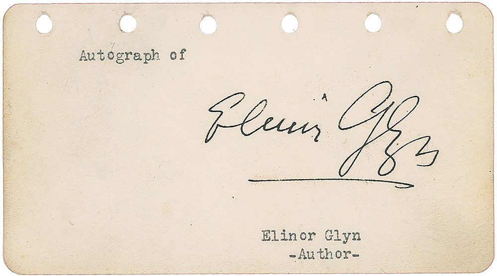 British novelist and scriptwriter (1864–1943) who pioneered mass-market women's erotic fiction. She coined the use of ‘It’ as a euphemism for sex appeal. Vintage ink signature, “Elinor Glyn,” on an off-white 4.5 x 2.5 page. In fine condition, with light soiling to edges.
