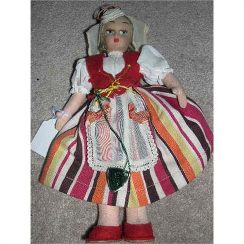 This doll is dressed in an international outfit and is from Argentina. The triangular shaped tag says Elios Florencia Industria Argentina.She's nice and crispy. There are a couple of tiny holes in her headpiece in the back. She is