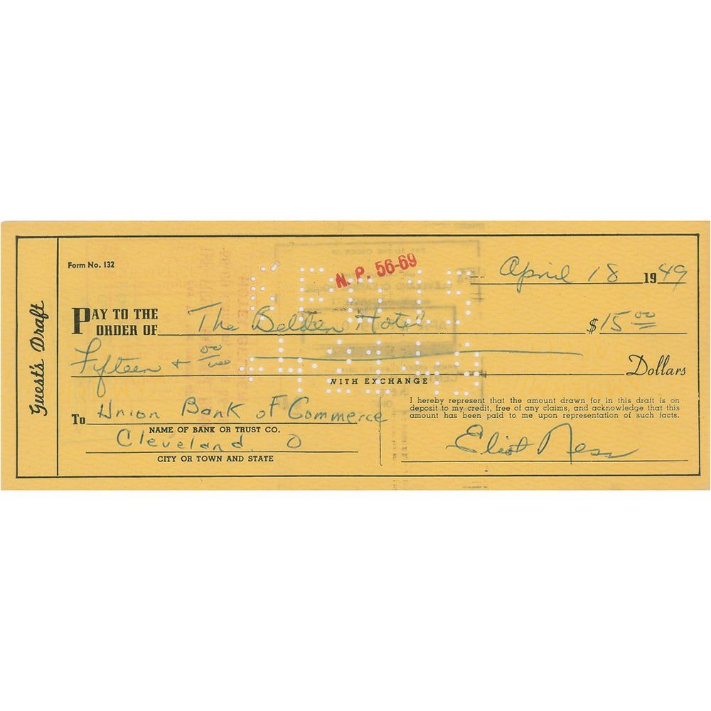 Guest's draft check, 8.25 x 3, filled out and signed by Ness, "Eliot Ness," payable to The Belden Hotel for $15, April 18, 1949. In fine condition.