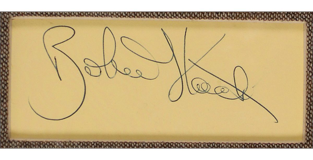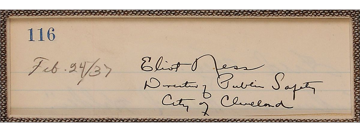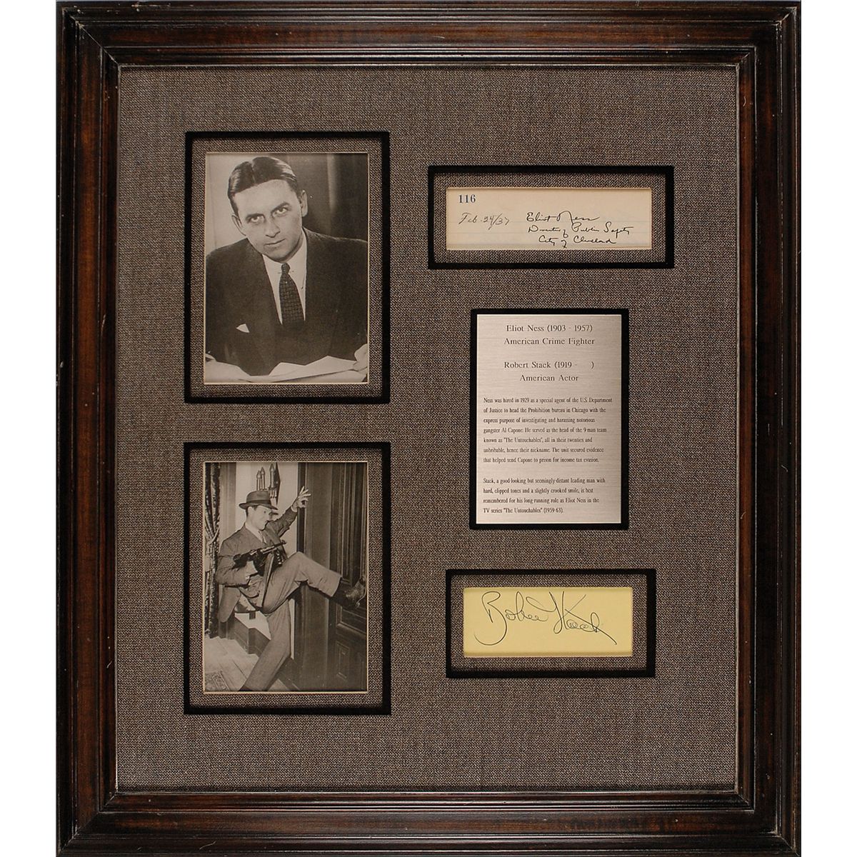 Vintage ink signature, “Eliot Ness, Director of Public Safety, City of Cleveland,” on an off-white lightly-lined slip removed from a larger register or guest book, and dated in another hand “Feb. 24/37”; and a ballpoint signature “Robert Stack,” on a light yellow card. Both are double cloth matted and framed together along with a photo of Ness and a photo of Stack as Ness, and a biographical plaque, to an overall size of 20.5 x 23.5. In fine condition, with some scattered light soiling to Ness’s slip. Oversized.