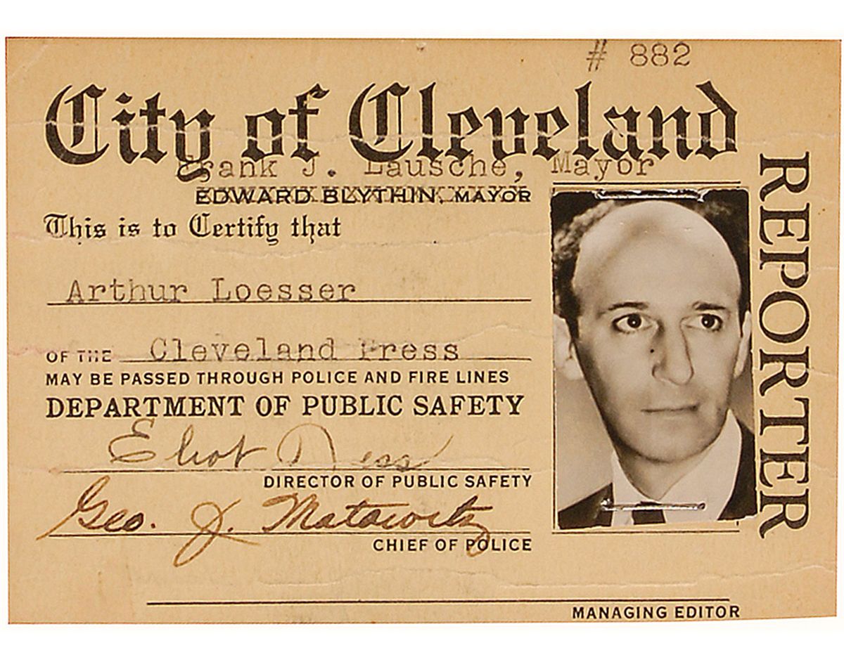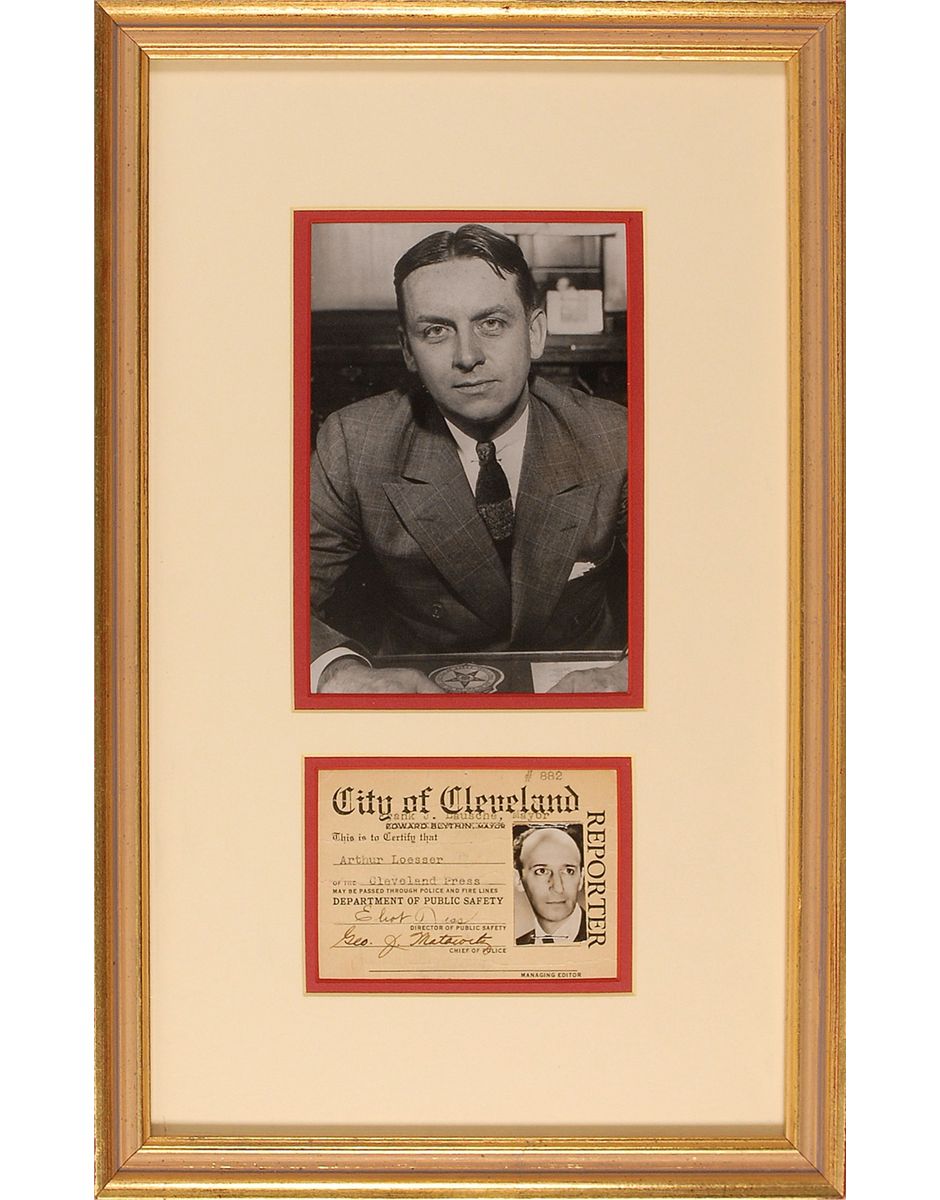 City of Cleveland press identification card issued to Arthur Loesser, 4 x 3, with a clipped snapshot of Loesser stapled to the right side, stating Loesser “of the Cleveland Press may be passed through police and fire lines.” Signed by Ness as the Director of Public Safety, and countersigned by the Cleveland Chief of Police. Mayor Edward Blythin’s name has been crossed out in type with Frank J. Lausche’s name typed above. Double-matted and framed with a photo of Ness at his desk to an overall size of 10 x 16. In very good condition, with horizontal creases, one lightly passing through portions of Ness’s signature, a bit of scattered light toning, and a typed notation to top edge.