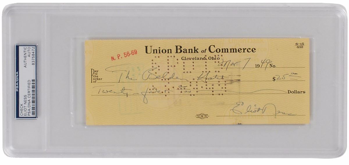Union Bank of Commerce check, 8 x 3, filled out and signed by Ness, payable to The Belden Hotel for $25, March 7, 1949. Encapsulated in a plastic PSA/DNA authentication holder. In fine condition, with expected bank stamps and cancellation holes.