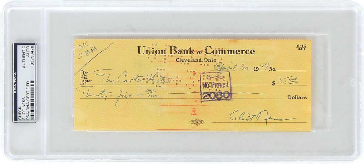 Leader of a special Prohibition squad (1903–1957), known as the Untouchables, which led to the downfall of Al Capone and his successor Frank Nitti, and the capture of John Dillinger. Union Bank of Commerce check, 8 x 3, filled out and signed by Ness, payable to The Carter Hotel for $35, April 30, 1949. Encapsulated in a plastic PSA/DNA authentication holder. In fine condition.