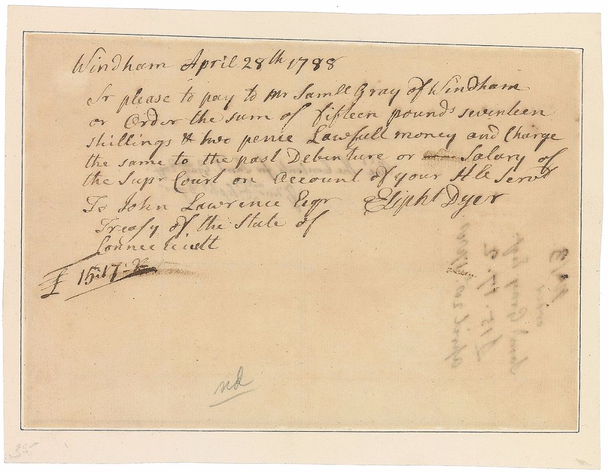 DS, signed “Elipht Dyer,” one page, 7.25 x 5, April 28, 1788. Pay order issued to Samuel Gray of Windham for “the sum of fifteen pounds seventeen shillings & two pence Lawful money and Charge the same to the past Debenture or Salary of the Supr. Court.” Signed at the conclusion by Dyer. Professionally inlaid to a slightly larger sheet. In fine condition, with show-through from docketing to reverse.