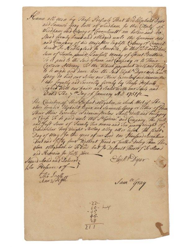 ELIPHALET DYER. (1721-1807). American lawyer, jurist, military leader and statesman. Document Signed One page, 7 1/4” x 12”. Windham, Connecticut. January 7, 1751/2. Document Signed, “Elipht Dyer” The document reads, in part: “Know all men by these presents that we Eliphalet Dyer and Samuel Gray both of Windham In the country of Windham and colony of Connecticut are holden and do stand firmly bound and obliged unto the Governor and Company of his Majesties English Colony of Connecticut in New England in New England in America … the condition of their present obligation is such that if the above bounded … shall well and truly pay or cause to be paid unto the sd. Governor and Company the full and just sum of twenty two ounces and ten penny weigh of coined silver … at or before the first day of May in the year of our Lord one thousand seven hundred and fifty four without fraud or further delay then the above obligation is so void … ” Paper wafer seal at the signature of both Dyer and Gray. Verso bear acknowledge of receipt of debt from both Samuel Gray and Major Dyer. Very Fine.