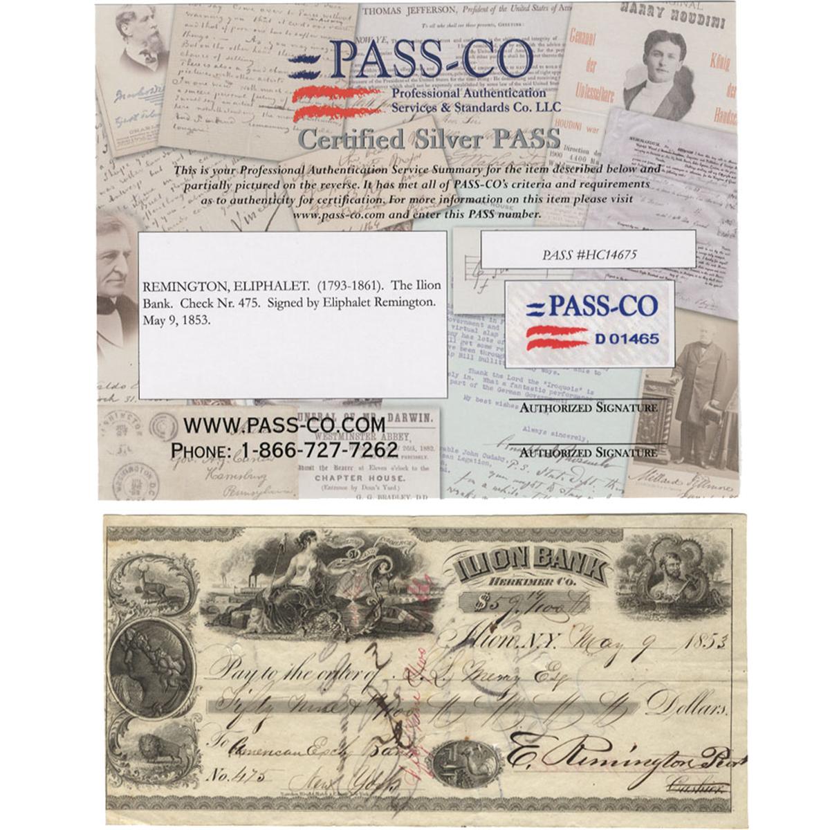 ELIPHALET REMINGTON (1793 - 1861). Early gun maker. Founder of E. Remington & Sons. Remington supplied guns to the United States during the Mexican-Amercian War. Partially Printed Check Signed by Remington, 7 ¾” x 3 ¾”. Ilion, New York May 9, 1853. Check #475. Nice engraved check drawn on the Ilion Bank, Herkimer County. Pen and bank cut cancellation, all paper in tact. . Very Fine. This item is accompanied by a PASS-CO certified Silver PASS.