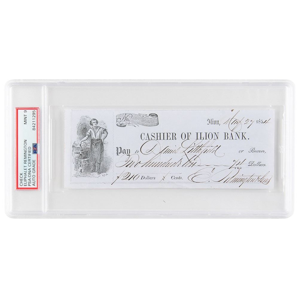 Cashier of Ilion Bank check, 7 x 2.5, filled out and signed by Eliphalet Remington, "E. Remington & Sons," payable to Daniel Littlefield for $210.74, May 27, 1854. In fine condition. Encapsulated in a PSA/DNA authentication holder, grading the autograph as "MINT 9."