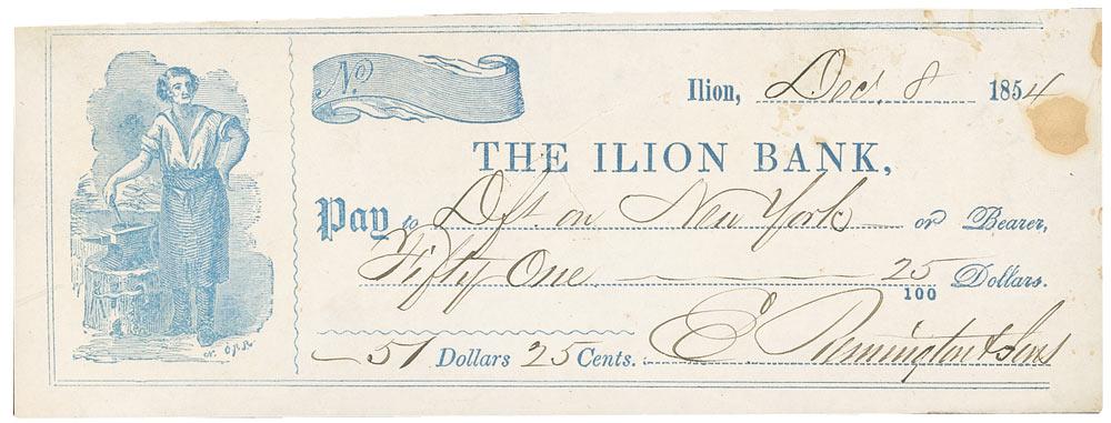 Nineteenth-century firearms manufacturer and son of the designer of the original Remington rifle. Bank check, 7 x 2.5, filled out and signed “E. Remington & Sons,” payable to Dft. on New York for $51.25, December 8, 1854. A couple of creases, spots of staining not affecting his signature, and usual cancellation cut to body of check, otherwise fine condition.
