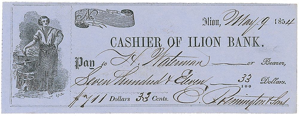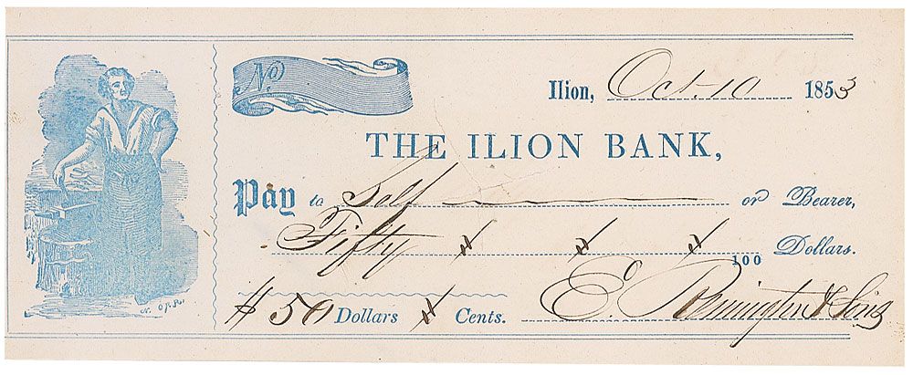 Two bank checks, each approximately 6.75 x 2.75, filled out and signed by Remington, “E. Remington & Sons,” dated October 10, 1853, and May 9, 1854. In overall fine condition, with expected cancellation cuts (not affecting the signatures).