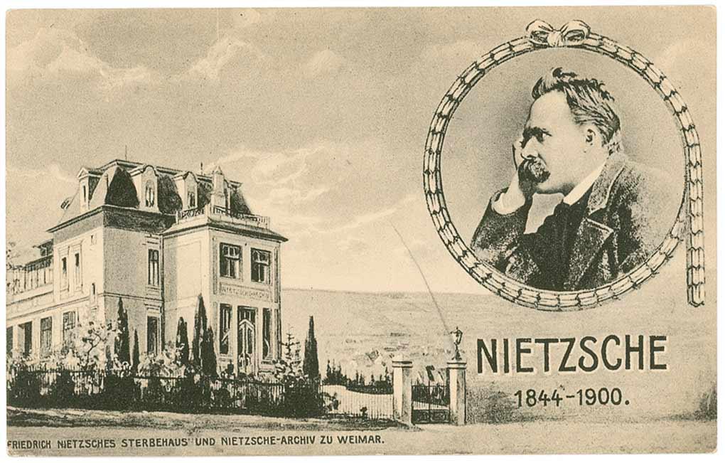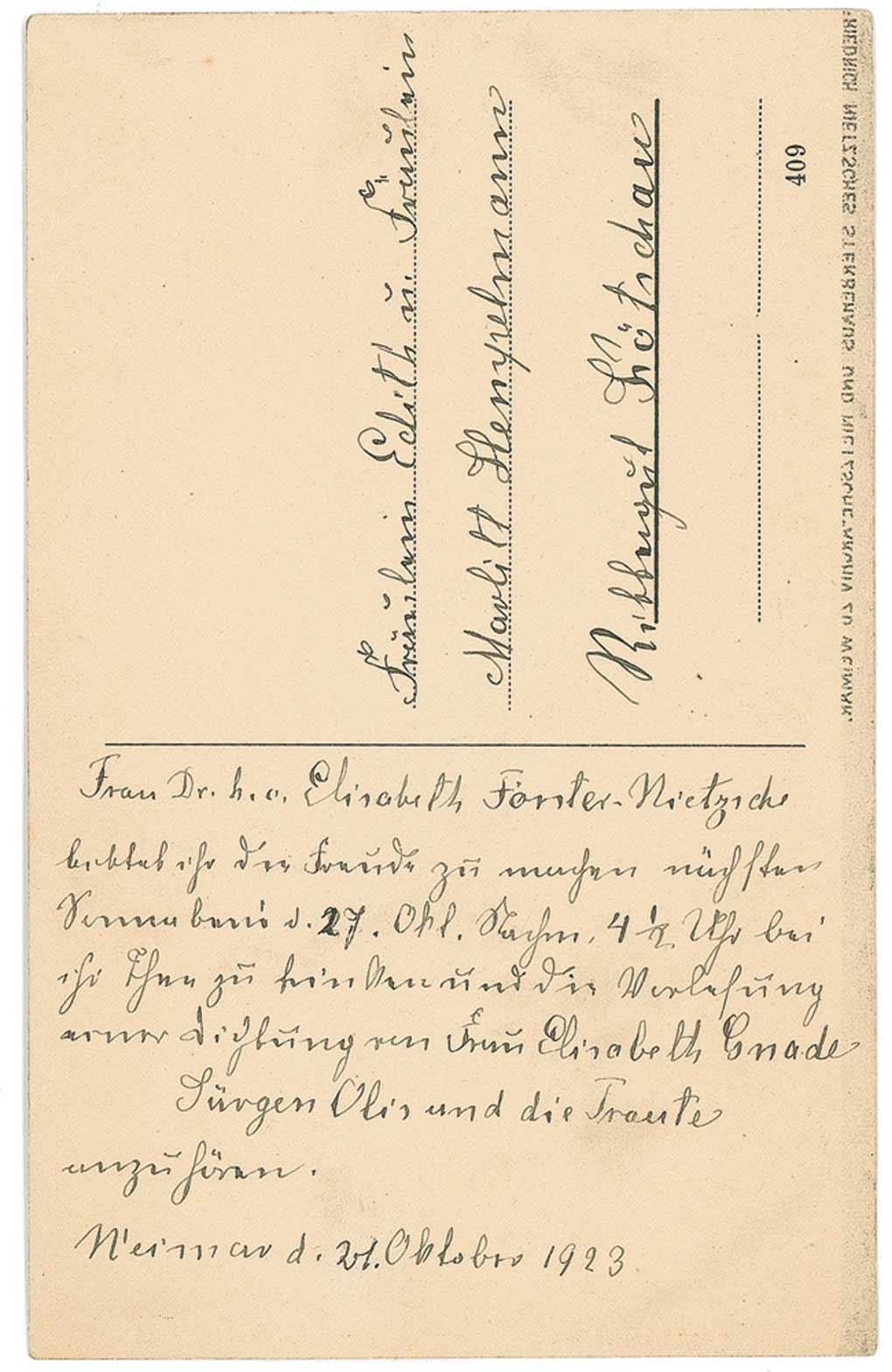 Sister of philosopher Friedrich Nietzsche and the creator of the Nietzsche Archive in 1894. Third-person ALS in German, on the correspondence side of a picture postcard with an image of the house where Friedrich Nietzsche died, 3.5 x 5.5, October 2, 1923. Neatly penned brief third-person ALS, inviting the Hempelmann sisters to come to the Rittergut Kötschau. In fine condition, with a touch of light soiling.
