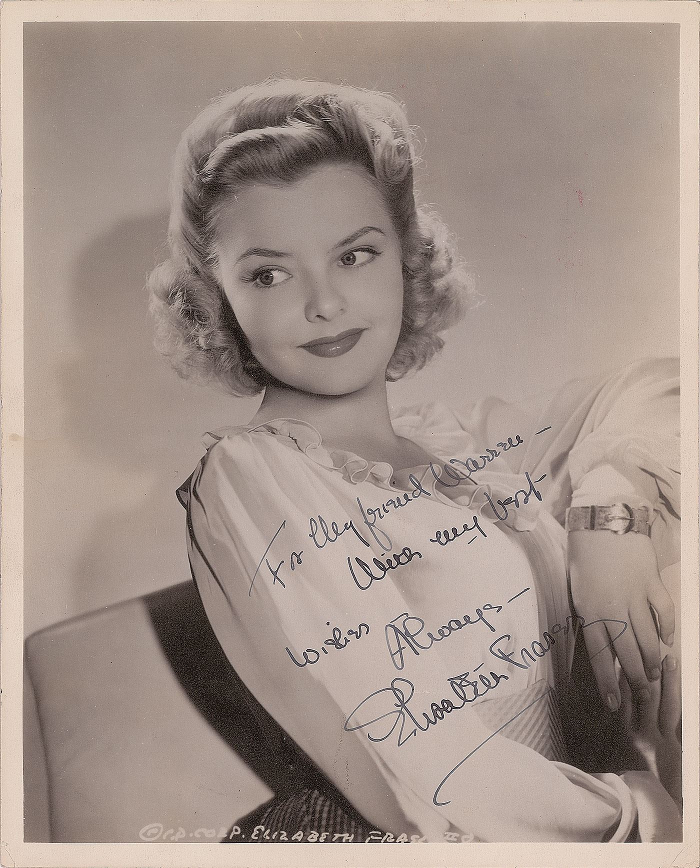 American television, film and stage actress (1920–2005) who was best known for playing brassy blondes. Vintage matte-finish 8 x 10 studio portrait of Fraser in a beautiful half-length pose, signed and inscribed in fountain pen, "For my friend Warren—With my best wishes, Always—Elisabeth Fraser.” In fine condition.
