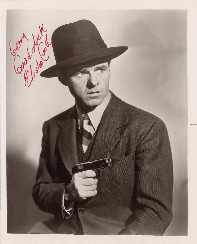 Glossy 8 x 10 photo of Elisha drawing a pistol, signed and inscribed in red felt tip “Gerry, Good luck, Elisha Cook.” In fine condition.