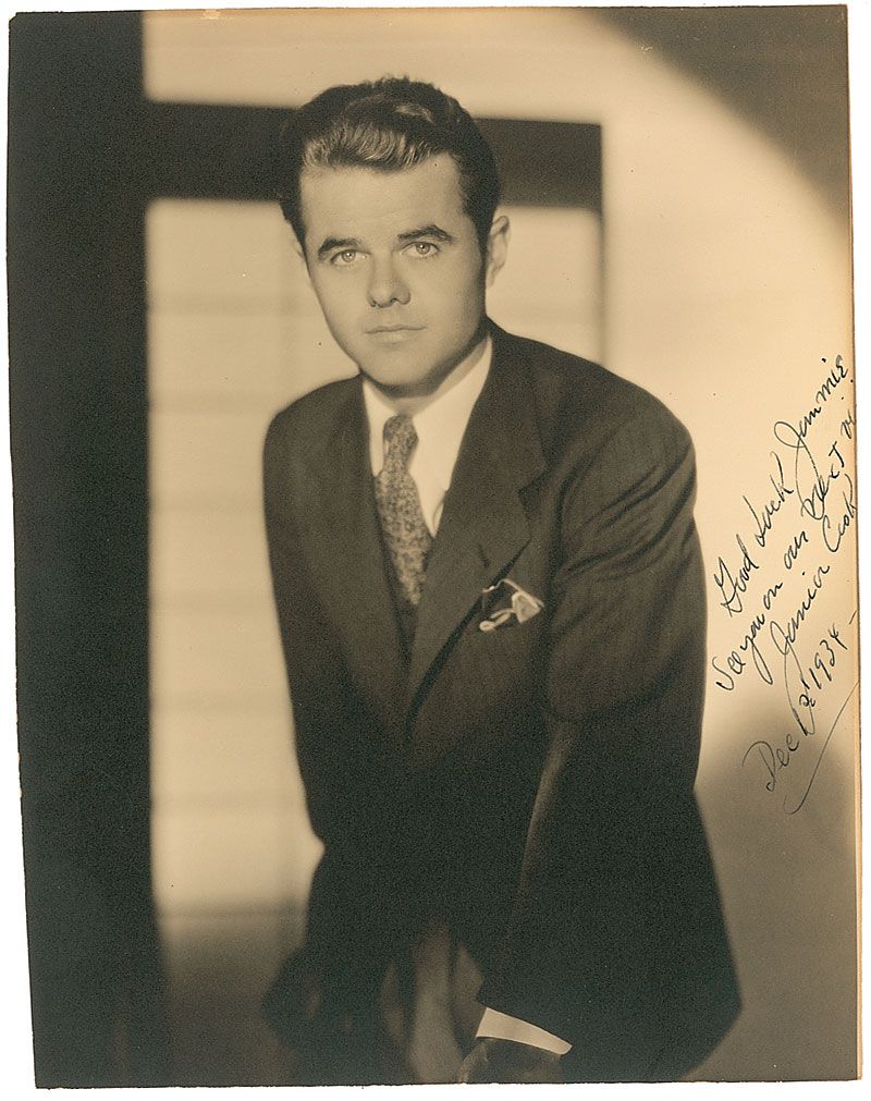 Vintage matte-finish 7 x 9 photo, signed and inscribed in fountain pen, “Good luck Jimmie, see you on our next visit, Junior Cook, Dec. 12, 1934.” In fine condition, with closely trimmed right edge, with other edges slightly trimmed as well.