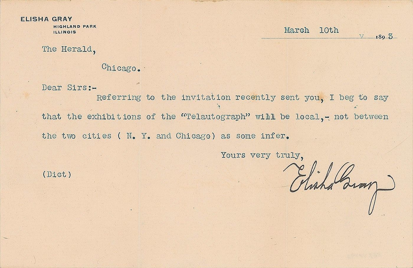 American electrical engineer (1835–1901) who co-founded the Western Electric Manufacturing Company and is best known for his development of a telephone prototype in 1876; he is also credited as the father of the modern music synthesizer and the creator of the telautograph, an analog precursor to the modern fax machine. Rare TLS, one page, 8.25 x 5.25, personal letterhead, March 10, 1893. Letter to the Chicago Herald, in full: "Referring to the invitation recently sent you, I beg to say that the exhibition of the 'Telautograph' will be local,—not between the two cities (N.Y. and Chicago) so some infer." Included with the letter is an early example of a telautograph message, accompanied by its original handwritten missive; both messages, each one page, 5 x 9.75, read, in full: "New Haven Conn, June 21,—1894, Compliments of the 'Telautograph' to the Class of 94 of the Hillhouse High School—and to their friends." In fine condition. Gray patented the telautograph on July 31, 1888, and stated that the telautograph would allow 'one to transmit his own handwriting to a distant point over a two-wire circuit.' The telautograph was first publicly exhibited at the 1893 World's Columbian Exposition held in Chicago.