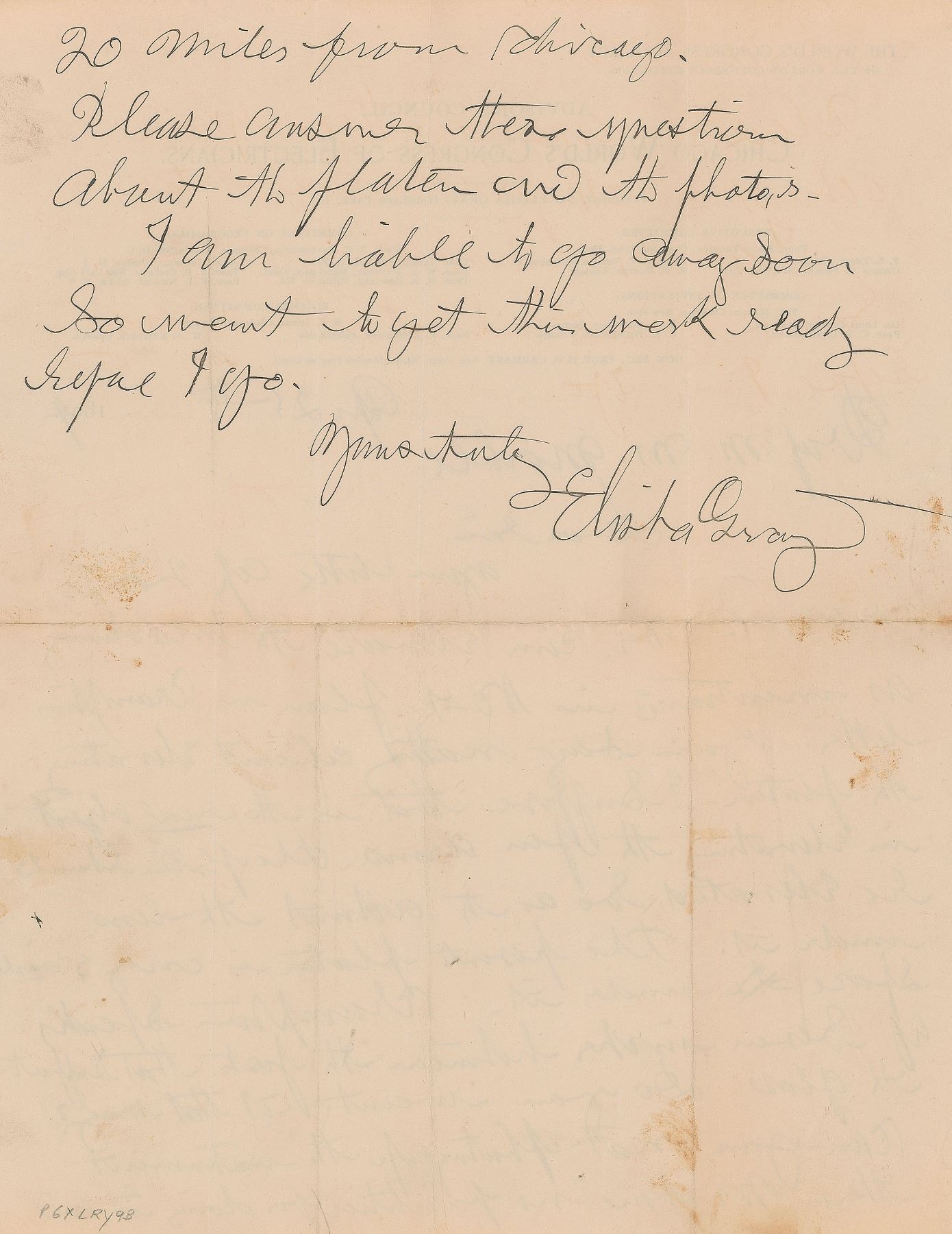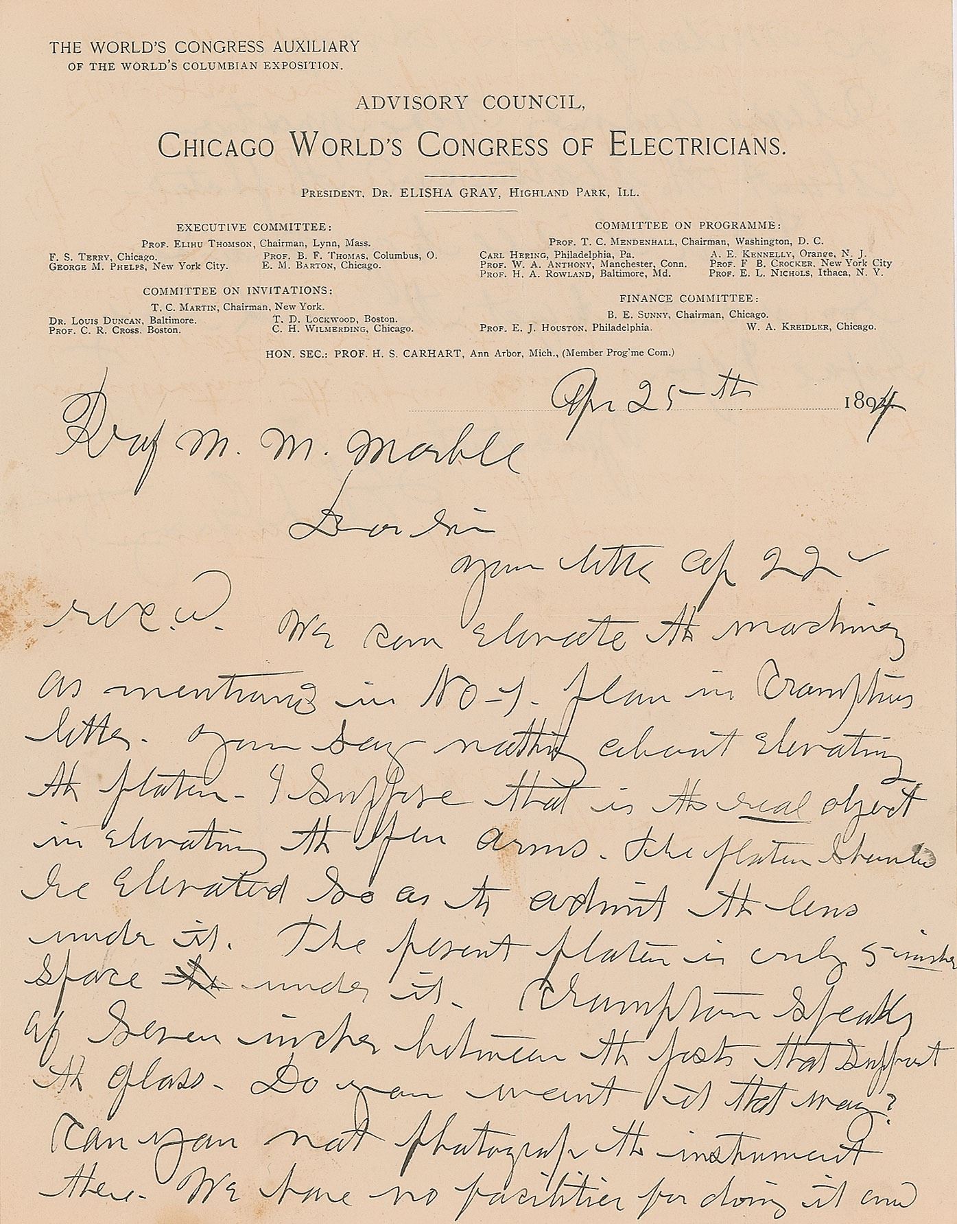 ALS, one page both sides, 8.5 x 11, Chicago World's Congress of Electricians letterhead, April 25, 1894. Letter to Professor M. M. Marble, in part: "You say nothing about elevating the platen. I suppose that is the real object in elevating the…arms. The platen should be elevated so as to admit the lens under it. The present platen is only 5 inches space under it…Can you not photograph the instrument there. We have no facilities for doing it and 20 miles from Chicago. Please answer these questions about the platen and the photos." In fine condition, with some light stains, and several extra vertical folds.
