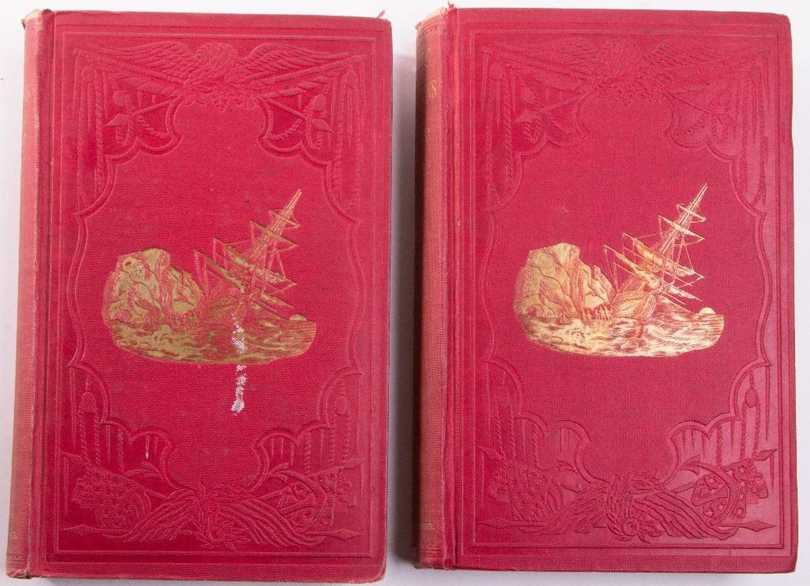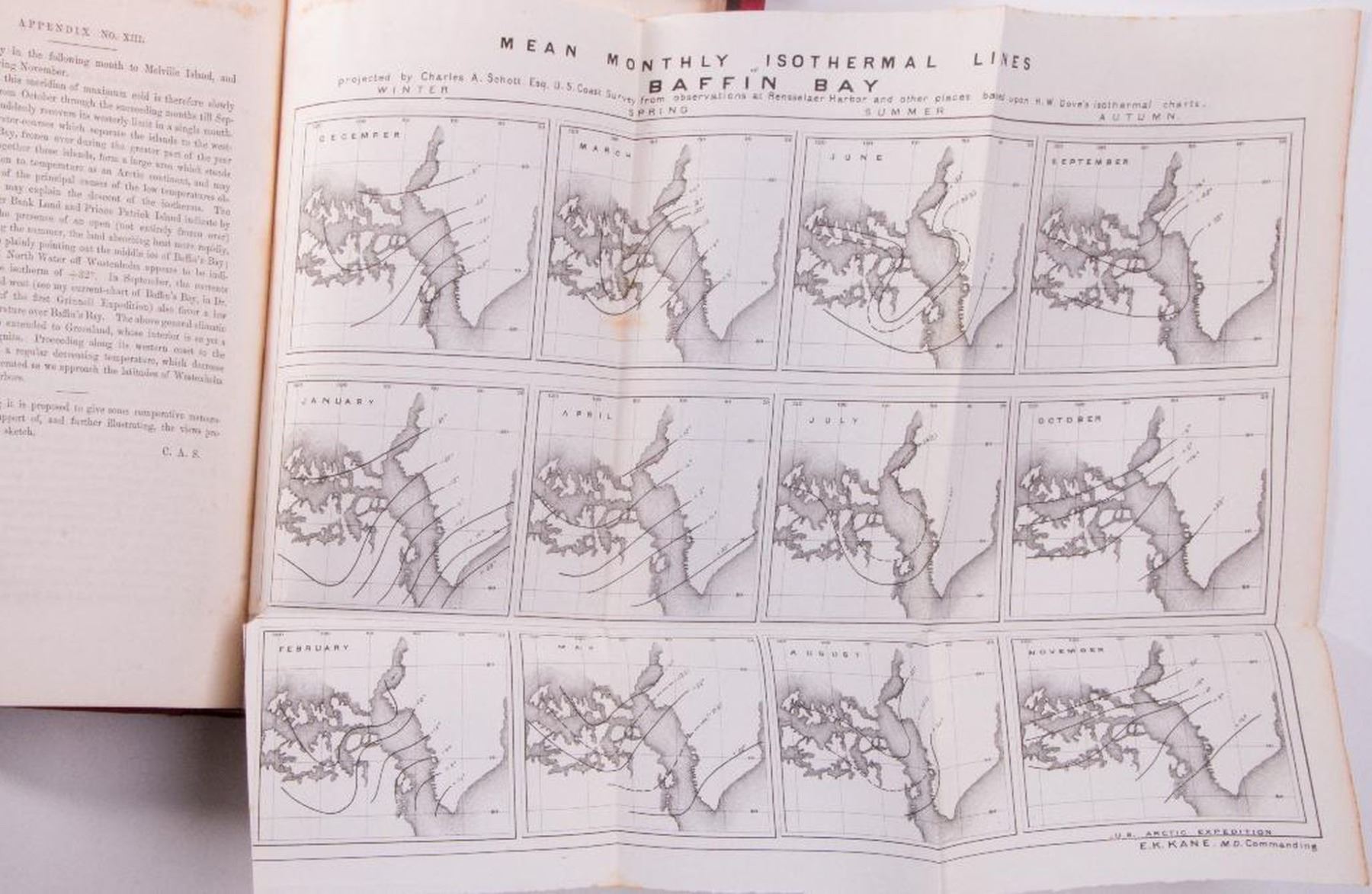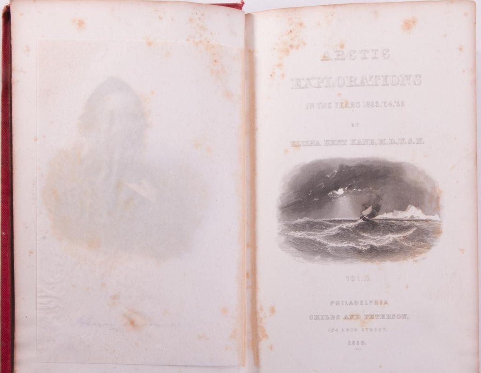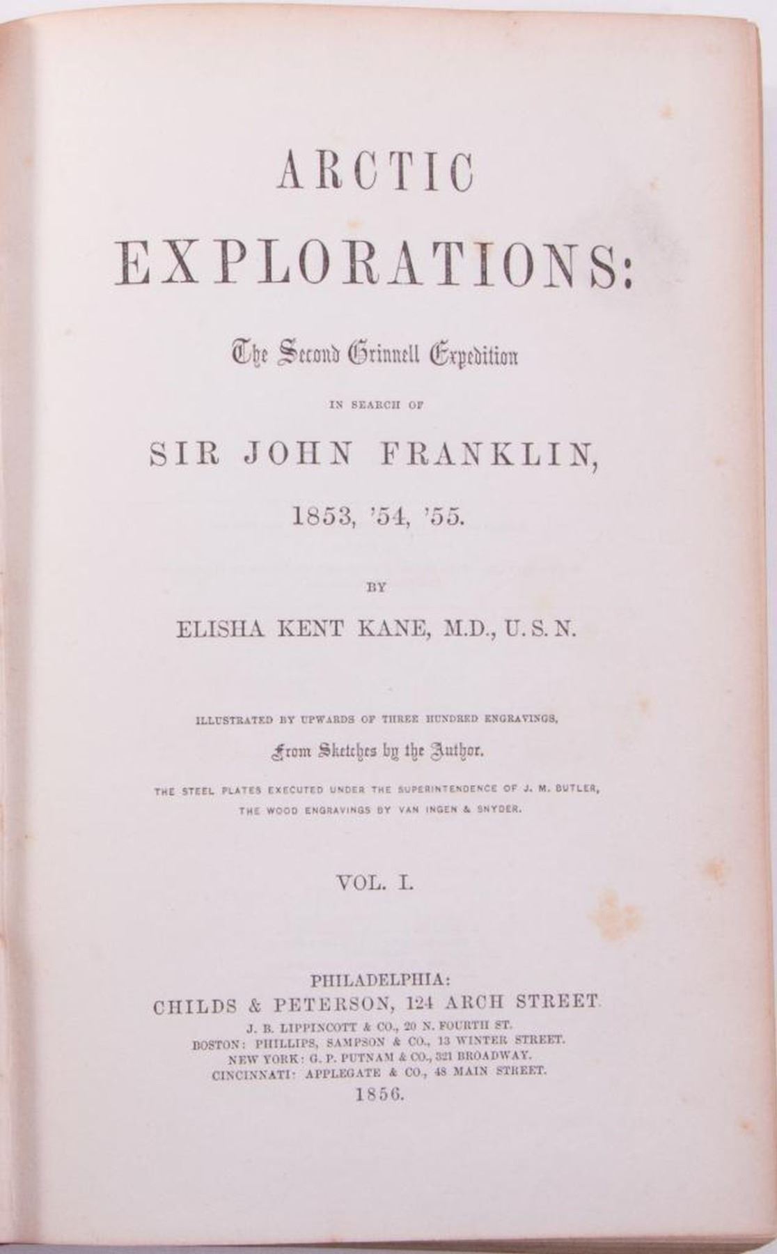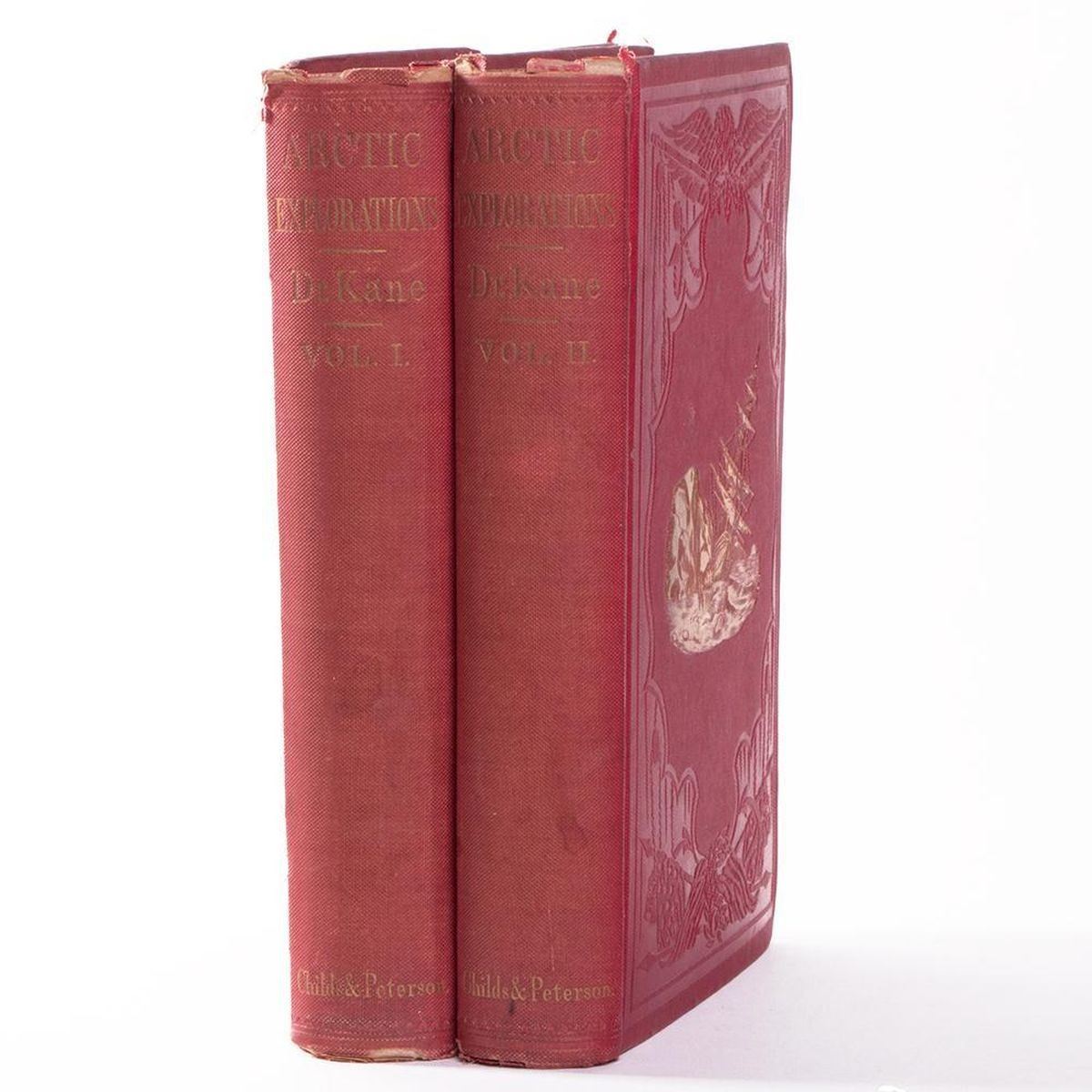 Title: Arctice Explorations: The Second Grinnell Expedition in Search of Sir John Franklin, 1853-1855 (in 2 Volumes) Author: Elisha Kent Kane, M.D., U.S.N. Place: Philadelphia Publisher: Childs and Peterson Date: 1856 Description: Arctic expedition was funded by the Geographical Society of New York as well as the Smithsonian Institute. Bound in red cloth with gilt design and gilt writing on spines. Condition: Volume 1 is in good condition. Cloth spine cover is almost separated from cover board. White mark on front cover board. Some foxing to pages. Volume two is in very good condition. Some foxing to pages. Overall, bumping, rubbing and sunning to spines for both volumes.