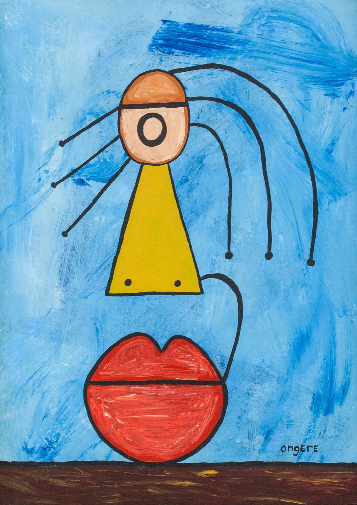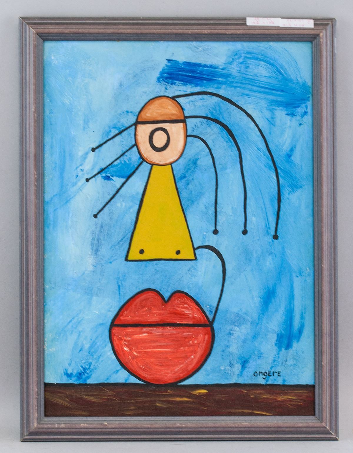 Oil on canvas, framed. Featuring an abstract portrait. Signed ONGERE on the lower right corner. Attributed to Elisha Ongere (20th century, Kenyan). 48 x 35 cm (18.75 x 13.75 inches). Framed size: 55 x 41 cm (21.5 x 16 inches). PROVENANCE: This lot carries limited provenance from a Southern Ontario estate