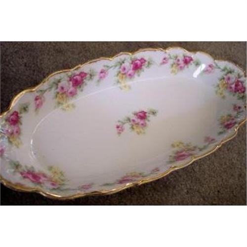 This is one of my favorite relish trays, by Elite, one of the foremost manufacturers of quality Limoges. This piece is oval in shape, with scalloped edges and gold trim. It is decorated with clusters of deep pink, pastel pink, and bright yellow roses with green accents and gold edging.<p>This item measures just over 12 inches long. With the exception of some minor wear to the gold trim, it is in excellent condition: there are no hairlines, fleabites, chips, or any other damage of any kind.