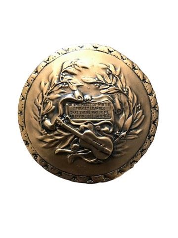 Heavy Copper Medallion found at Elvis Presley's Hillcrest Beverly Hills Home. The following quote by author Albert Camus is on the medallion: In the midst of winter I finally learned that there was in me an invincible summer. Includes COA and an insert from answers.com about his favorite books. The Stranger, by Albert Camus was one of his favorites and the author wrote the quote on the medallion. Heavy bronze. Numbered 86/20,000 on the back. (3")