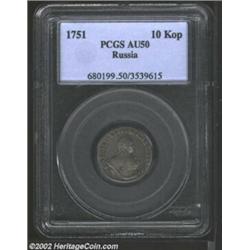 Elizabeth 10 kopecks 1751, Bust right/Crown above value and date, UZD-840, KM-16a, AU50 PCGS. Important notice: We expect to be auctioning lots at the rate of 200-250 per hour. Sometimes eBay Premier live bid software cannot keep up with that pace, so we strongly recommend that you place a realistic proxy bid now as insurance to avoid disappointment. Also please note that all Heritage/CAA lots purchased through eBay Premier carry a 20% Buyer's Premium. Please make sure you read the Terms and Conditions.