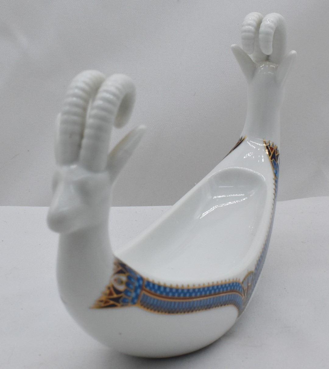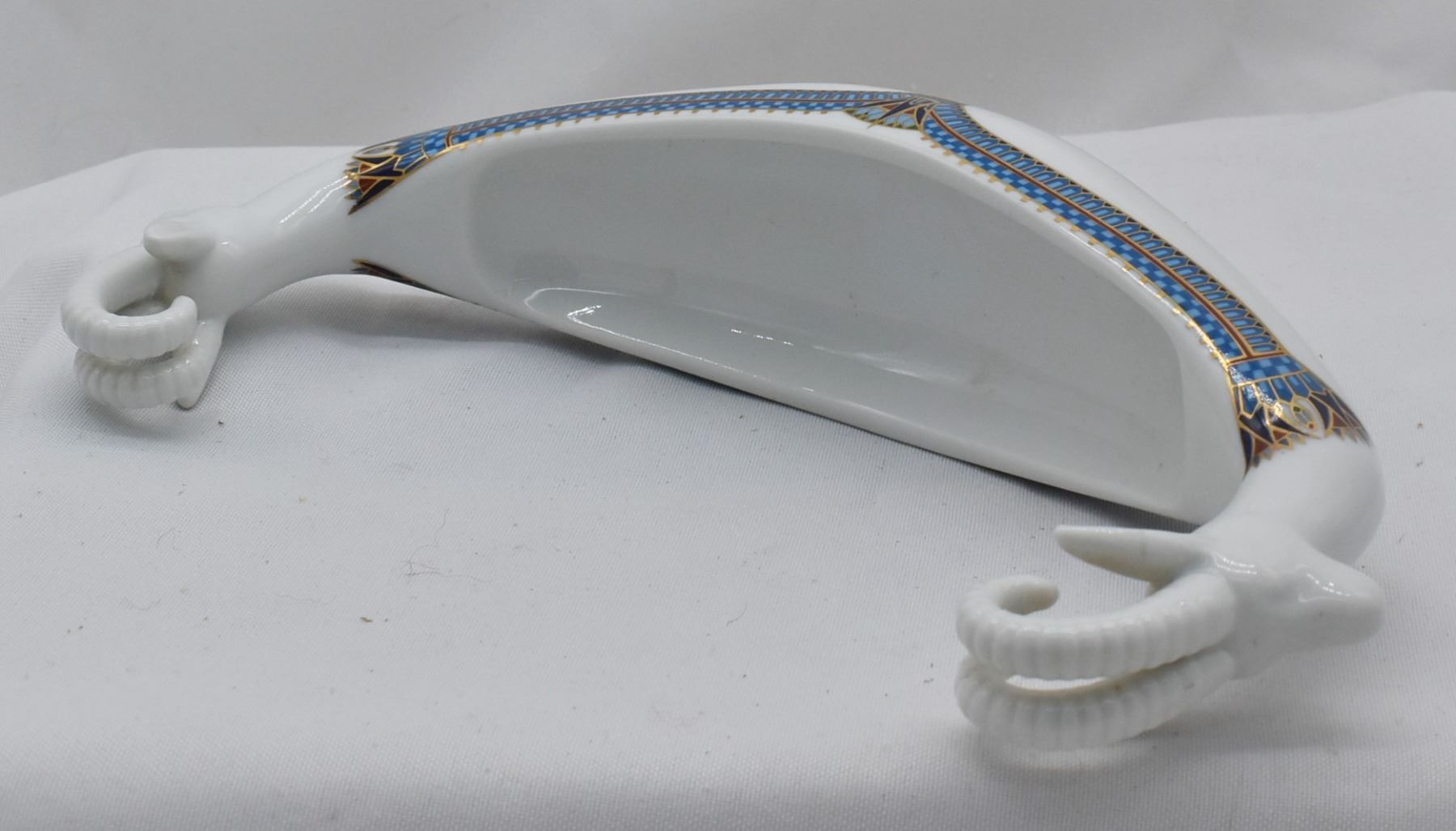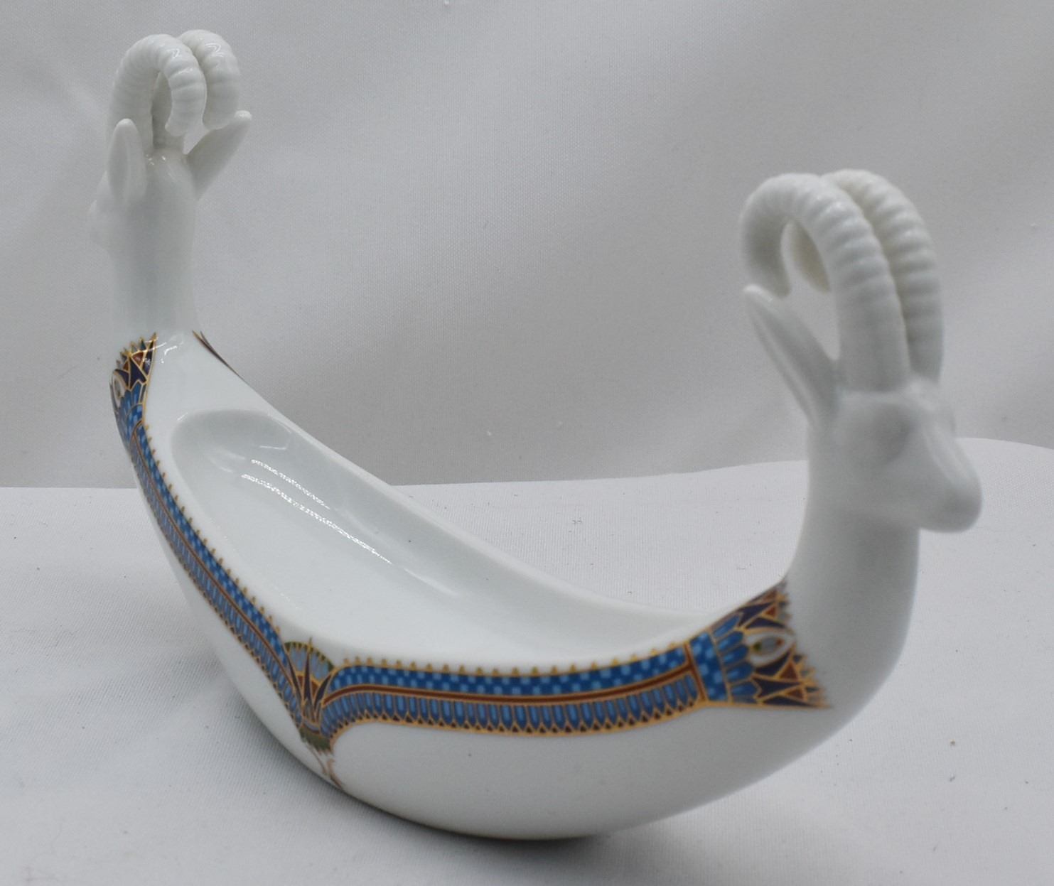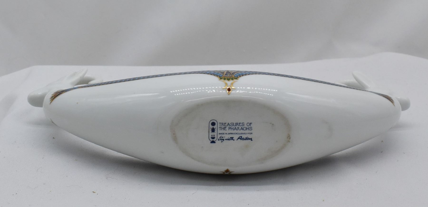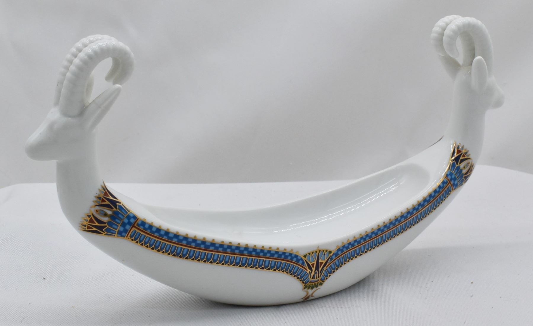 Elizabeth Arden Treasures of the Pharaohs Ceramic Double Ram's Head Boat, made in Japan, measures 9.5'' x 2'', marked on the bottom