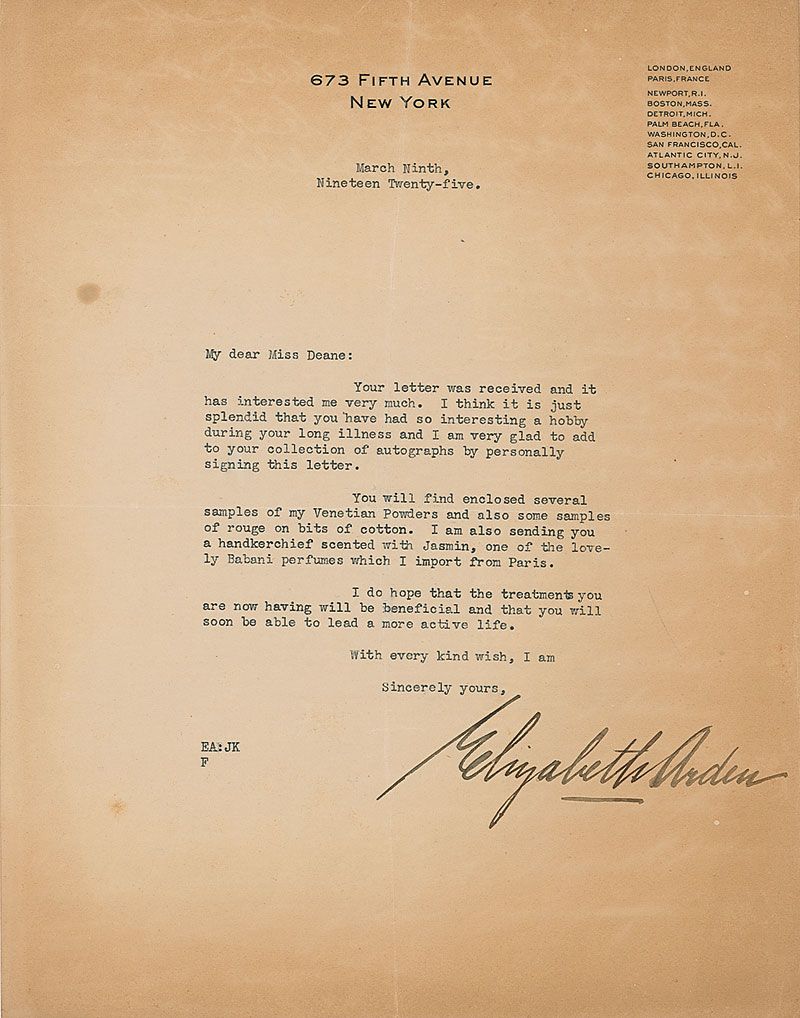 Beautician (1884–1966) who developed the highly successful cosmetic line that bears her name. TLS, one page, 8.5 x 11, personal letterhead, March 9, 1925. Letter to a young collector battling an illness. In part: “I think it is just splendid that you have had so interesting a hobby during your long illness…You will find enclosed several samples of my Venetian Powders and also some samples of rouge…I hope that the treatments you are now having will be beneficial and that you will soon be able to lead a more active life.” In very good condition, with central horizontal and vertical folds and moderate toning.