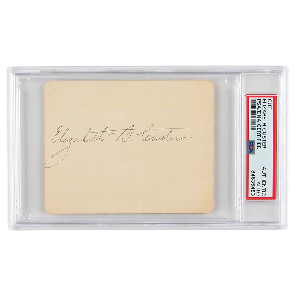 Vintage ink signature, "Elizabeth B. Custer,†on an off-white 4.25 x 3.25 card. Ink notation to reverse dates the autograph to Tannerville, New York, September 20, 1894. In fine condition. Encapsulated in a PSA/DNA authentication holder.