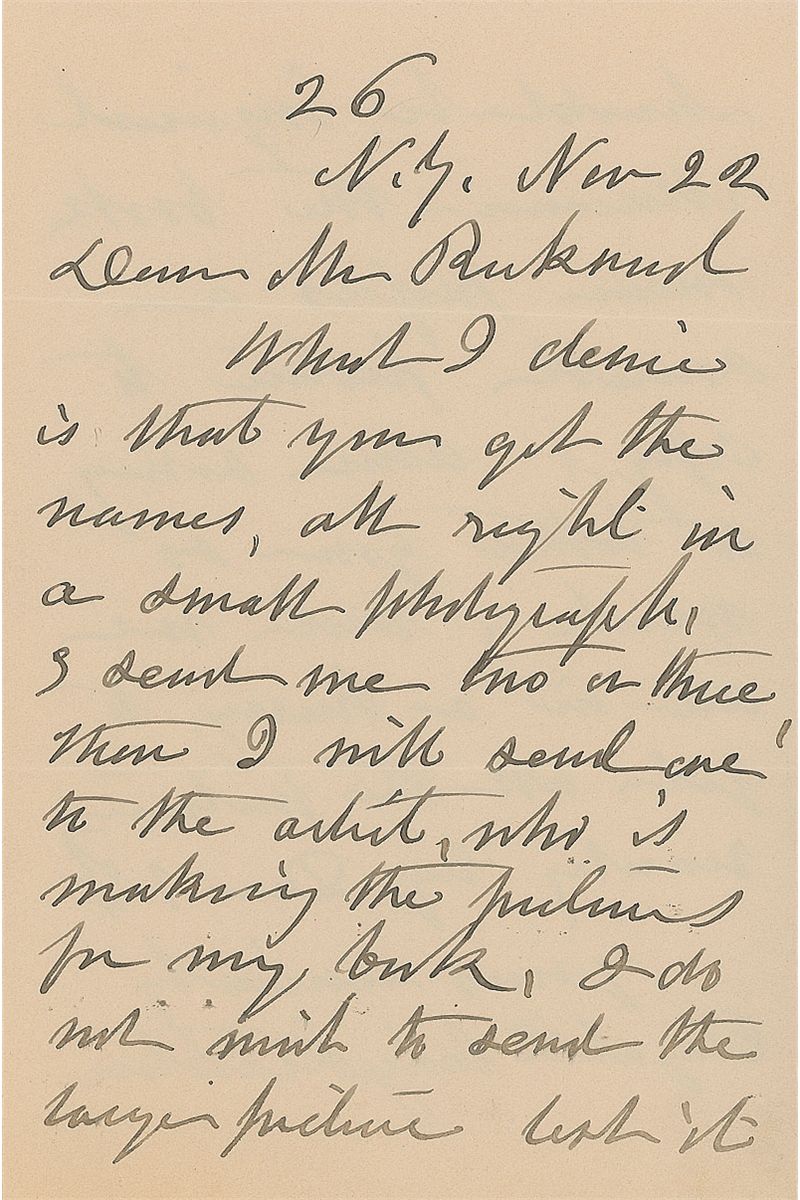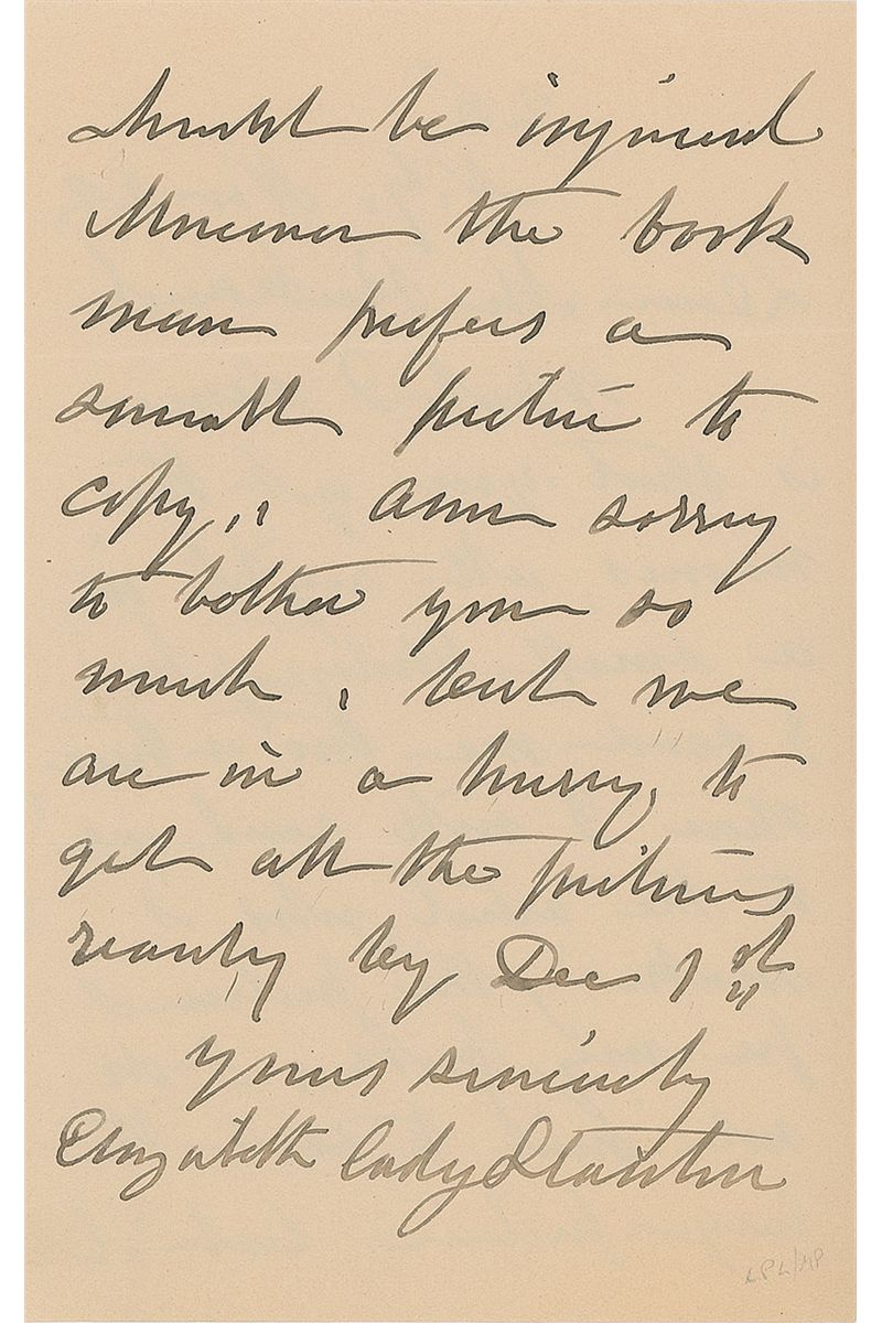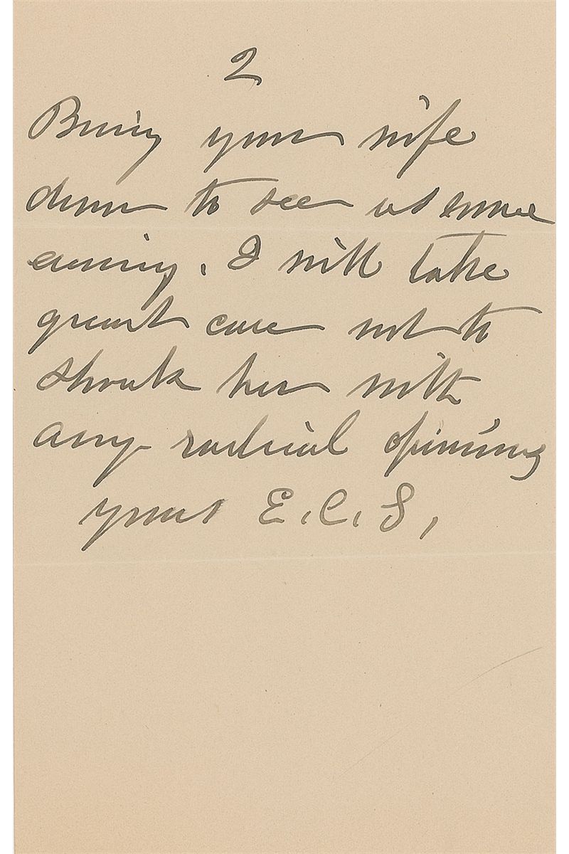 ALS, three pages on two sheets, 5.5 x 9, November 22, no year. Letter to “Mr. Rockwood.” In full: “What I desire is that you get the names, all right in a small photograph, & send me two or three, then I will send one to the artist, who is making the pictures for my book. I do not wish to send the large picture lest it should be injured. Moreover the book man prefers a small picture to copy. Am sorry to bother you so much, but we are in a hurry to get all the pictures ready by Dec. 1st.” Second page bears a postscript initialed “E. C. S.,” in full: “Bring your wife down to see us some evening. I will take care not to shock her with any radical opinions.” In fine condition. Accompanied by an original unsigned carte-de-visite portrait of Stanton by C. D. Mosher of Chicago. Stanton’s most well-known sitting with Rockwell came in 1895, the same year she published The Woman's Bible, and she also wrote a memoir in 1898—she probably desired Rockwell’s portrait for inclusion in one of them. A humorous letter from the great women’s rights leader.