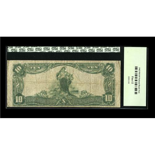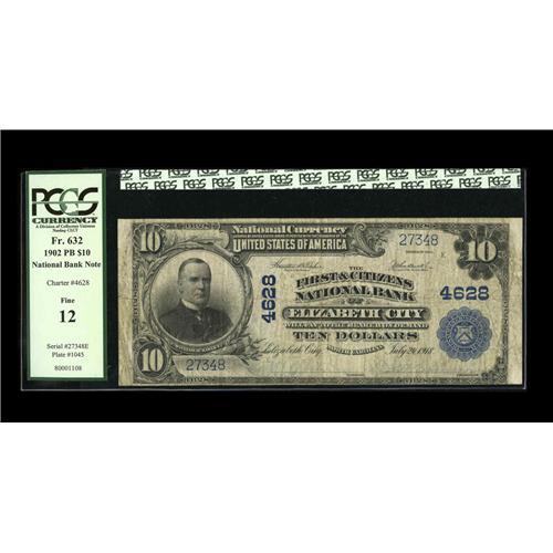 <B>Elizabeth City, NC</B></I> - $10 1902 Plain Back Fr. 632 <B>The First & Citizens NB </B></I> Ch. # 4628<BR>Like the other example we offer from here in this type and denomination with <B>PCGS Fine 12</B></I> credentials tonight, this otherwise problem free <B>PCGS Fine 12</B></I> is somewhat closely trimmed.