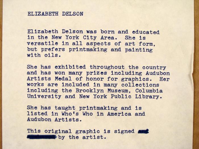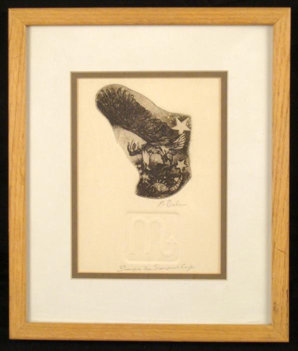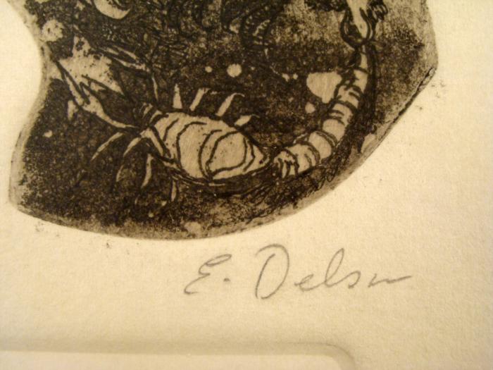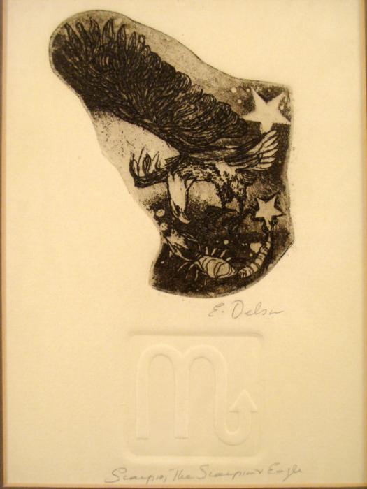 This orginal etching portrays a scorpion fending off the threatening talons of an eagle. Underneath is an embossed symbol for the zodiac sign Scorpio. * Artist: Elizabeth Delson Title: "Scorpio, The Scorpion & Eagle" Signature: In pencil Medium: Etching on paper Sheet size: As showing, 5 1/2 x 8 1/2 inches Framing: Double matted in dark beige and white, in natural tone wood frame Frame size: 11 x 13 inches Condition: Excellent; light wear to frame This is a fine lithograph from one of the more brilliant and talented women of her generation. * Biography: Attached to the back (see photo) *