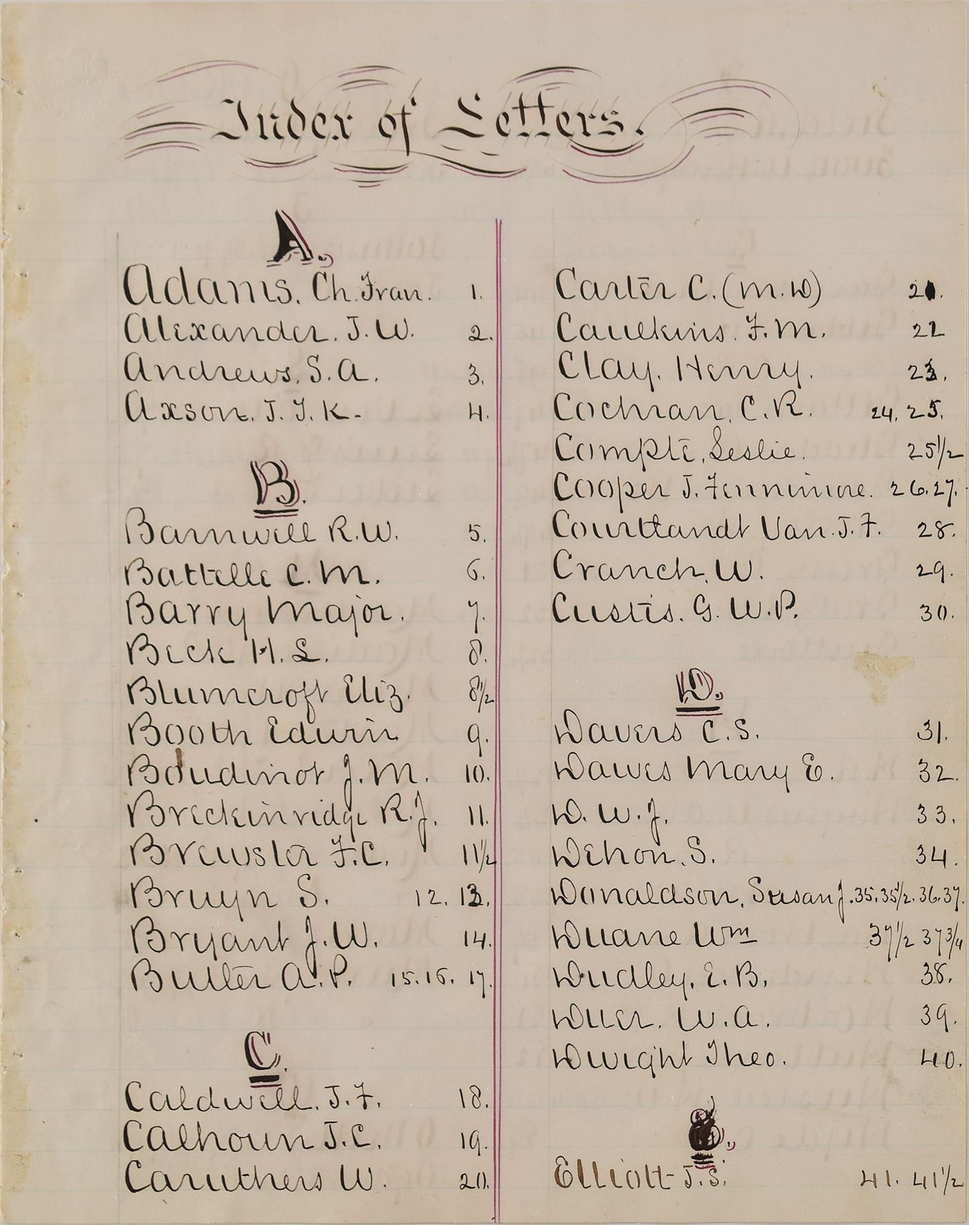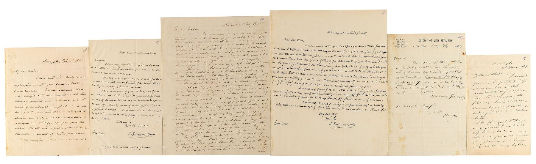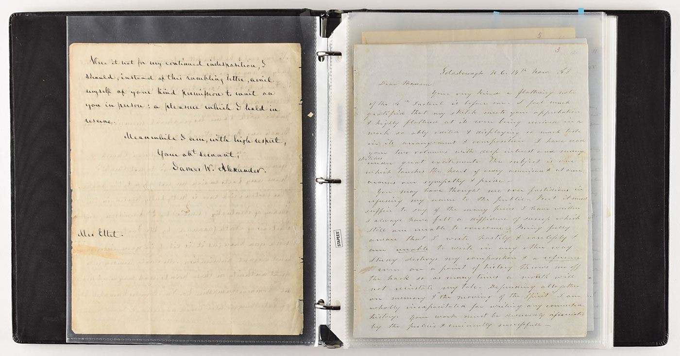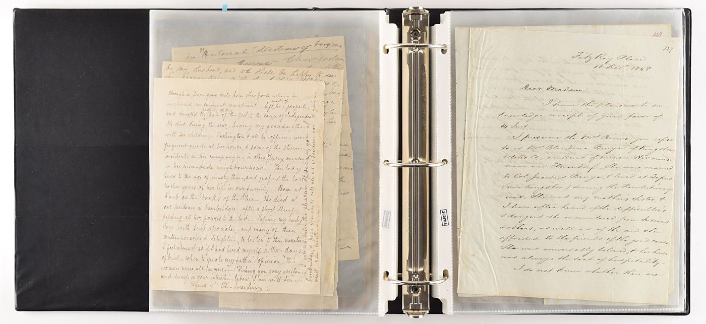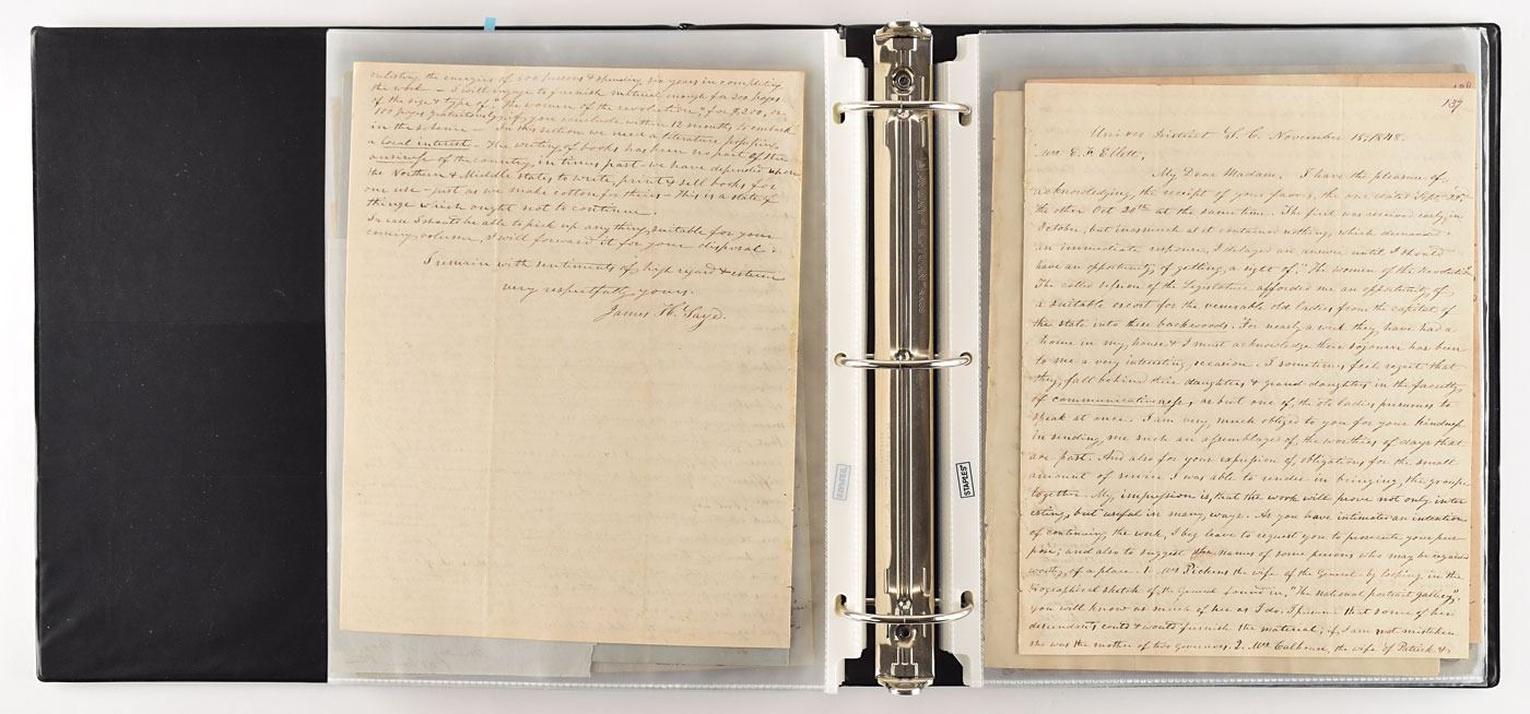 American historian and poet (1818–1877) who was the first writer to record the lives of women who contributed to the American Revolutionary War. Marvelous collection of approximately 170 letters sent to American writer, historian and poet Elizabeth F. Ellet by a wide assortment of influential 19th century figures, among which includes actors, authors, lawyers, politicians, educators, theologians, and other professions. The archive includes an alphabetized handwritten index, with corresponding number annotated in the upper right corner of each letter. Highlights include: John C. Calhoun, Henry Clay, James Fenimore Cooper (2), Horace Greeley, and Washington Irving, with other notables including: Charles Francis Adams, Sr., James Waddel Alexander, Robert Woodward Barnwell, Robert Jefferson Breckinridge, F. Carroll Brewster, Andrew Butler, Catherine Van Cortland, William Cranch, George Washington Parke Custis, William J. Duane, Theodore Dwight, George Robert Lewis, Francis Lieber, Horace Mann, Lindley Murray, John G. Palfrey, Francis Wilkinson Pickens, Charles Constantine Pise, Joel Roberts Poinsett, William H. Prescott, William C. Preston, Eliza Susan Quincy, William Bradford Reed, Lorenzo Sabine, James H. Saye, Henry Schoolcraft, Henry Hopkins Sibley, William Gilmore Simms, Jared Sparks, Charles Stewart, Frederic Tudor, and James Watson Webb. The majority of the letters consist of responses regarding Ellet’s research on the roles of women in the American Revolutionary War; all are housed in a pair of three-ring binders. In overall fine condition.