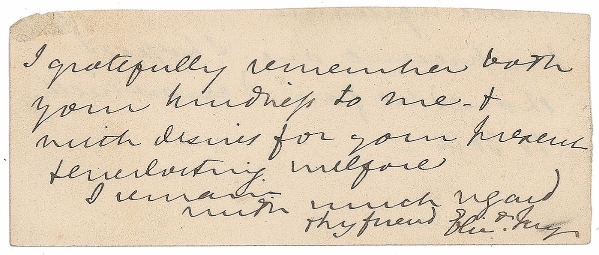 Quaker humanitarian and reformer of English prisons (1780–1845). ANS signed “Eliz. Fry,” one page, 4.5 x 1.75, no date. Short note, in full: “I gratefully remember both your kindness to me, & with desires for your present & everlasting welfare.” In fine condition.