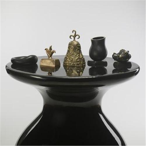 Elizabeth Garouste and Mattia Bonetti<BR>collection of five table accessories<BR>BGH Editions/Blome<BR>France, 1992/1996<BR>cast and patinated bronze<BR>2.75 dia x 4.5 h inches<BR>Dimensions provided for the largest form.<BR>Two items sold with original boxes. Impressed signature to the underside of four examples: [Blome B.G] or [B.G].<BR><BR>Condition of the item is not included in this description. Condition reports are available from Wright upon request. Wright strongly recommends that you review a condition report for each item on which you plan to bid.