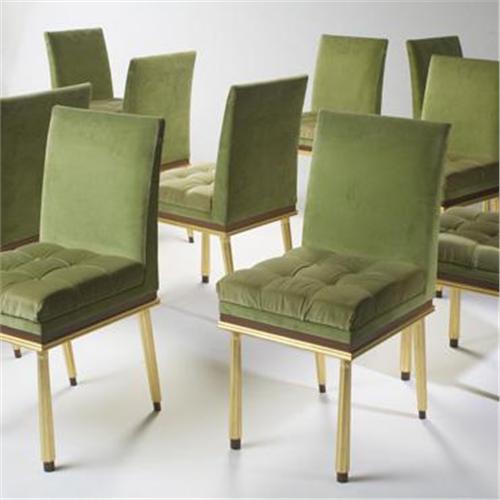 Elizabeth Garouste and Mattia Bonetti<BR>dining chairs, set of ten<BR>France, 1995<BR>upholstery, wenge, gilt wood<BR>16 w x 2.5 d x 34.75 h inches<BR>These works are unique. Sold with copy of original artist rendering and presentation material.<BR>Provenance: <BR>Private collection, Dawson Place, London<BR>Literature: <BR><i>Elizabeth Garouste & Mattia Bonetti</i>, Staudenmeyer et al., pg. 24 <i>Elizabeth Garouste & Mattia Bonetti: 1981-2001</i>, Vedrenne, ppg. 62-65 <i>Garouste & Bonetti</i>, Buck and Vogt, pg. 112 <i>Vogue</i>, British Edition, July 1995, ppg. 130-135<BR><BR>Condition of the item is not included in this description. Condition reports are available from Wright upon request. Wright strongly recommends that you review a condition report for each item on which you plan to bid.