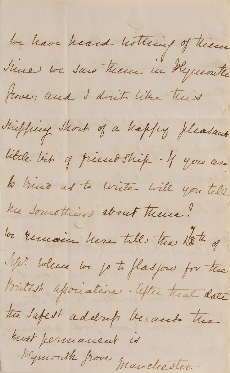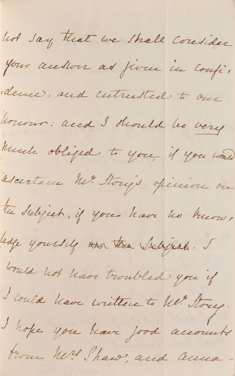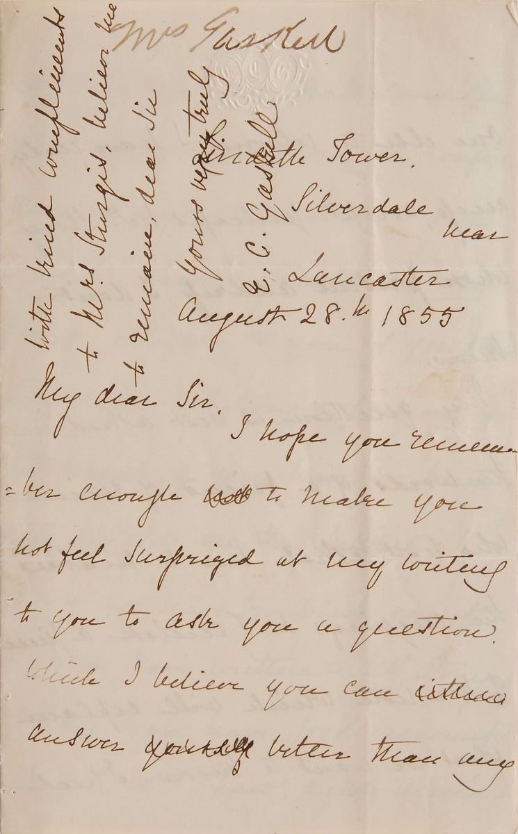 Victorian-era author (1810–1865) whose works detailed the lives of people in all classes of society, best known for her novel North and South. ALS signed “E. C. Gaskell,” four pages on two adjoining sheets, 4.5 x 7, August 28, 1855. Written from Lindeth Tower in Silverdale, near Lancaster, England, a letter to banker Russell Sturgis, in full: “I hope you remember enough to make you not feel surprized at my writing to you to ask you a question which I believe you can answer better than any one else to whom I have ready access, except perhaps Mr. Story whose present address I don’t know. My question is best asked in the words of a friend of mine who has asked me to make the enquiry; so I enclose a piece of her note which will explain what we want to know, I need not say that we shall consider your answer as given in confidence, and entrusted to your honour: and I should be very much obliged to you if you would ascertain Mr. Story’s opinion on the subject, if you have no knowledge yourself. I would not have trouble you if I could have written to Mr. Story. I hope you have good accounts from Mrs. Shaw, and Anna—We have heard nothing of them since we saw them in Plymouth Grove; and I don’t like this snipping short of a happy pleasant little bit of friendship—if you are so kind as to write will you tell me something about them! We remain here till the 7th of Sept’r when we go to Glasgow for the British Association. After that date the safest address because the most permanent is Plymouth Grove Massachusetts.” In fine condition, with intersecting folds.