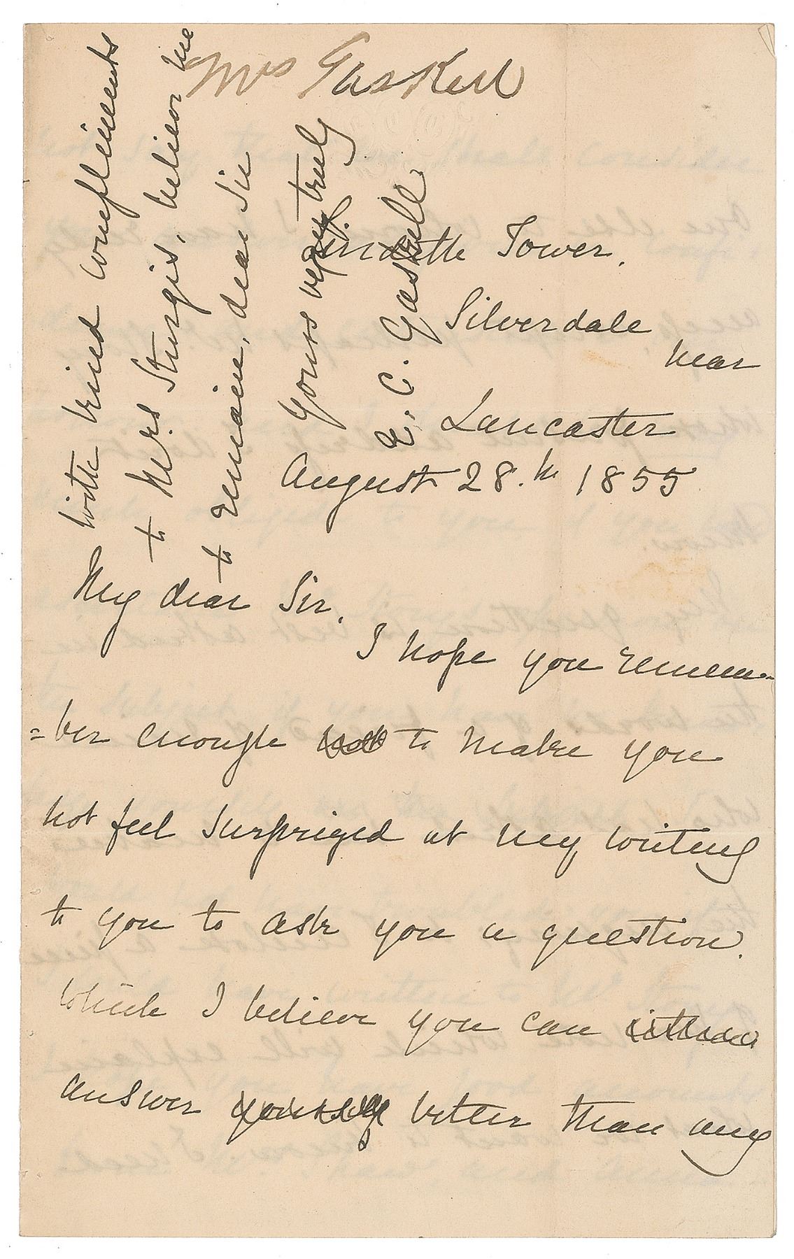 Victorian-era author (1810–1865) whose works detailed the lives of people in all classes of society, best known for her novel North and South. ALS signed "E. C. Gaskell," four pages on two adjoining sheets, 4.5 x 7, August 28, 1855. Written from Lindeth Tower in Silverdale, near Lancaster, England, a letter to banker Russell Sturgis, in full: "I hope you remember enough to make you not feel surprized at my writing to you to ask you a question which I believe you can answer better than any one else to whom I have ready access, except perhaps Mr. Story whose present address I don't know. My question is best asked in the words of a friend of mine who has asked me to make the enquiry; so I enclose a piece of her note which will explain what we want to know, I need not say that we shall consider your answer as given in confidence, and entrusted to your honour: and I should be very much obliged to you if you would ascertain Mr. Story's opinion on the subject, if you have no knowledge yourself. I would not have trouble you if I could have written to Mr. Story. I hope you have good accounts from Mrs. Shaw, and Anna-We have heard nothing of them since we saw them in Plymouth Grove; and I don't like this snipping short of a happy pleasant little bit of friendship-if you are so kind as to write will you tell me something about them! We remain here till the 7th of Sept'r when we go to Glasgow for the British Association. After that date the safest address because the most permanent is Plymouth Grove Massachusetts." In fine condition, with intersecting folds. Accompanied by an ALS by W. W. Story, who Gaskell mentions here.