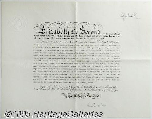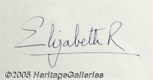 <B>Elizabeth I Signed Document as Queen of England</B></I> Partly-printed document signed "Elizabeth R" as Queen of Great Britain and Northern Ireland, 21" x 16.5", Court of St. James, November 16, 1954. An appointment of Frank Kenyon Roberts "to be Our Ambassador Extraordinary and Plenipotentiary at Belgrade... Federal People's Republic of Yugoslavia...." Usual folds, otherwise in excellent condition with a dark signature. <I>Accompanied by COA from PSA/DNA.</B></I>