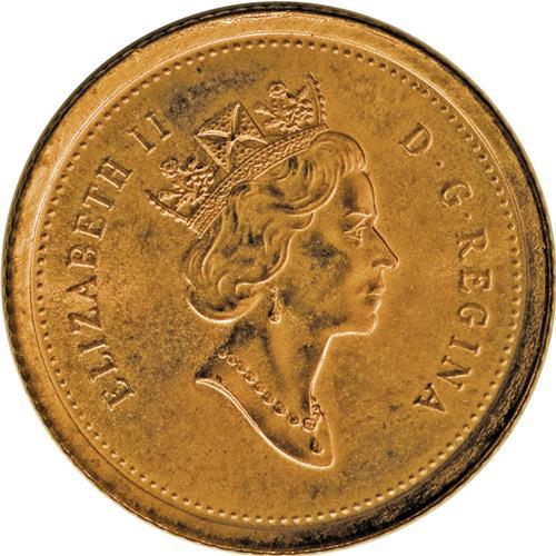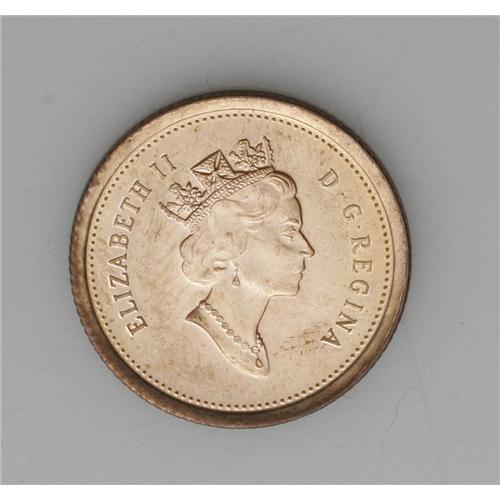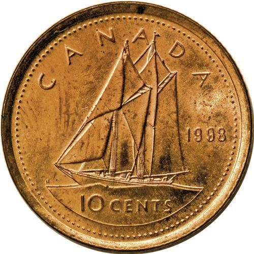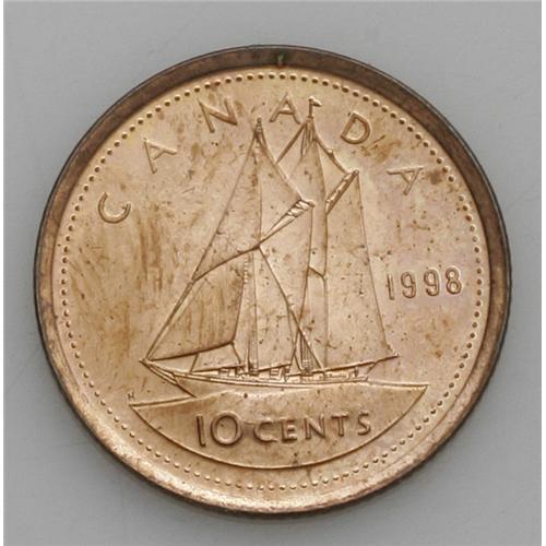 <B>Elizabeth II 10 Cents 1998 without nickel plating,</B></I> 1.88 gm, lustrous UNC with some spotting. This piece has the copper finish as the final nickel plating was not added.<BR><I>From the Dominion Collection.</B></I>