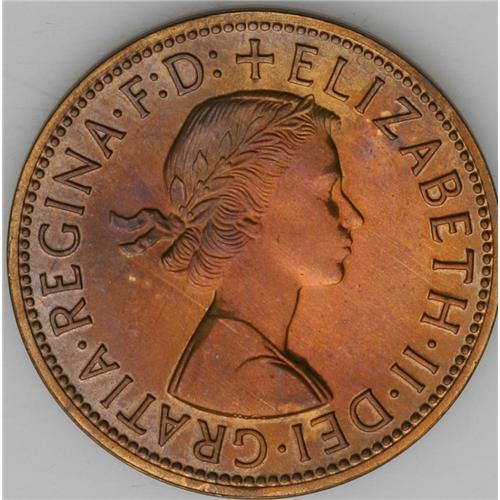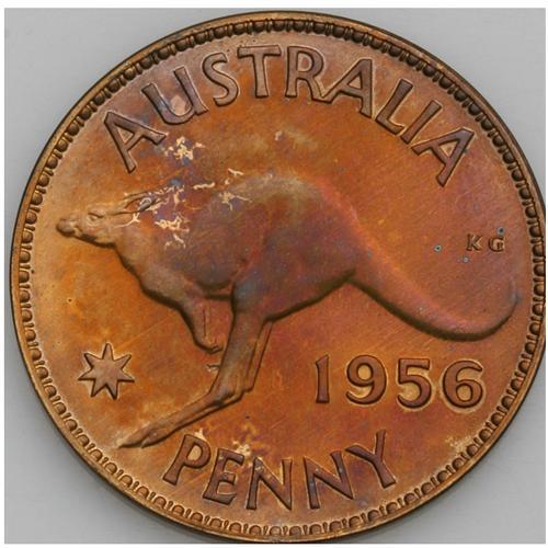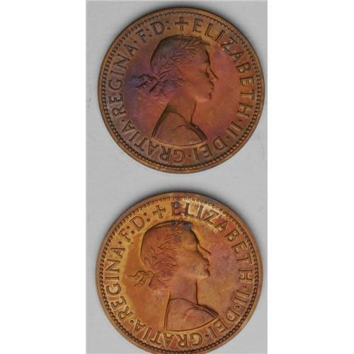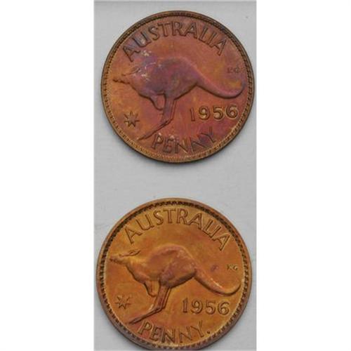 <B>Elizabeth II 1956 Proof Penny Pair, </B></I>KM56, Perth (with dot after Penny), Proof, and Melbourne, Proof, both with multicolored toning and a few tiny spots. The Perth issue for this date is rare with only 417 minted.