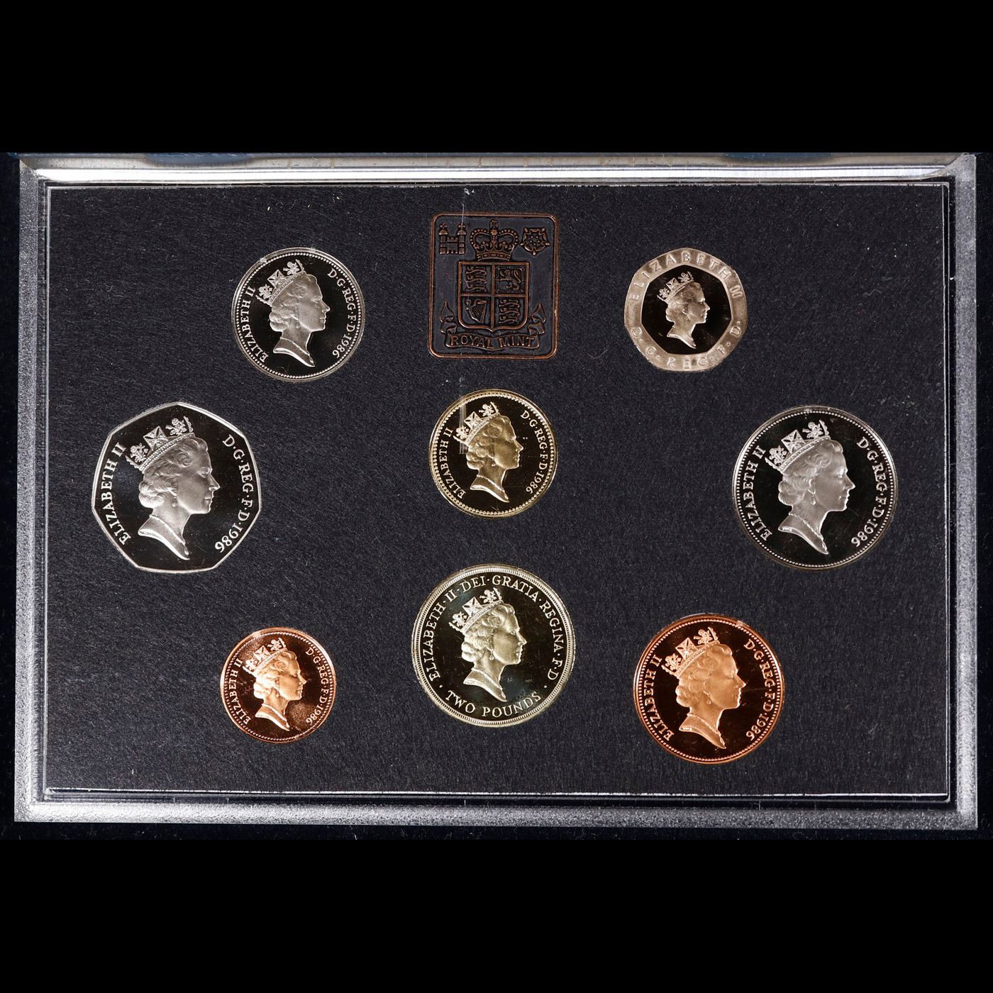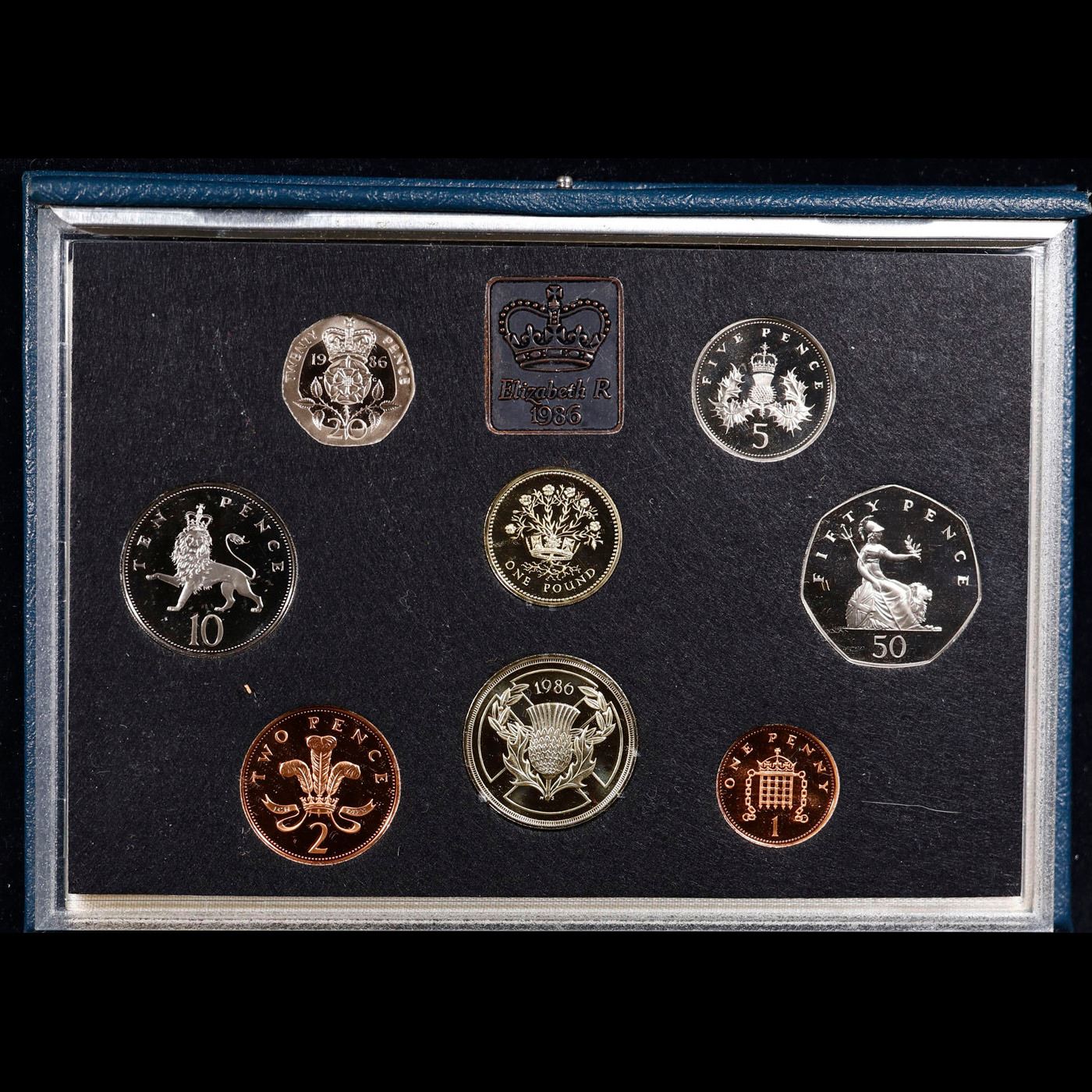 Elizabeth II, 1986 Royal Mint Proof Set 8 Coins Inside!!. In 1986 the Royal Mint, for the first time, issued a commemorative £2 piece and it was the first non-Gold £2 piece to ever be struck. This coin was issued for the Commonwealth Games which were held that year in Edinburgh. The Proof Set of 1986 also contains the £1, 50p, 20p, 10p, 5p, 2p and 1p. Very Important: the 1986 5p, 10p, 20p and 50p were not issued for circulation.
