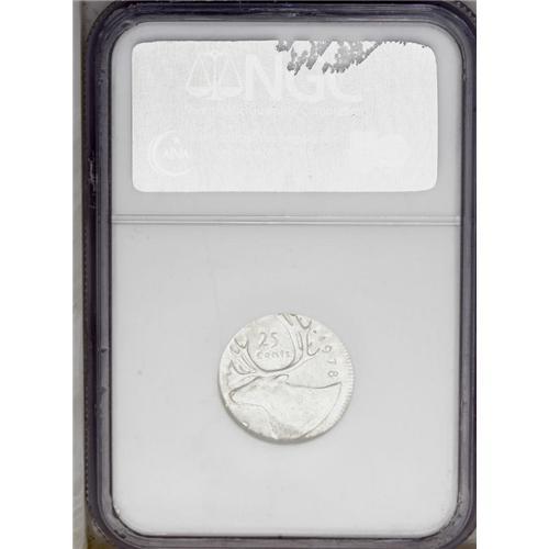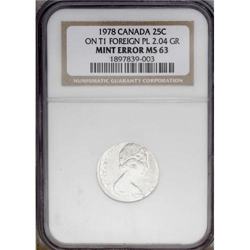 <B>Elizabeth II 25 Cents dated 1978 struck on a foreign planchet,</B></I> KM62b, MS63 NGC, the coin's weight is 2.04 gms where a regular 25 cent planchet's weight is 5.07 and no Canadian nickel coin has the weight of this piece.