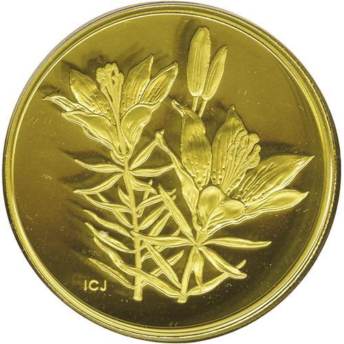 <B>Elizabeth II 350 Dollar Gold 2005,</B></I> This is known as the Western Red Lily coin struck by the Royal Canadian Mint in " .99999" fine gold, approx weight is 35.1 gms. The mintage was limited to 1,635 pieces. Included with this lot is the original case of issue along with the certificate of authenticity from the RCM and is serial numbered 00655.