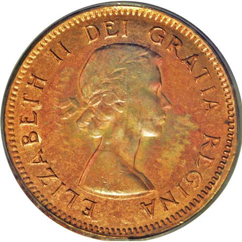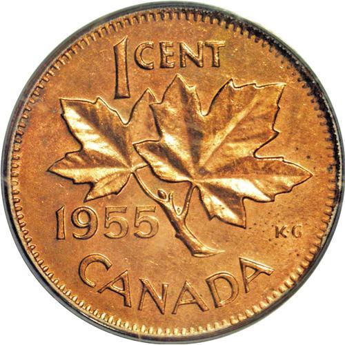 <B>Elizabeth II Cent 1955 No Strap, </B></I>KM49, MS64 RD PCGS, extremely rare variety in this quality. The Belzberg example, graded MS64 Red and Brown PCGS, brought $4600! This example exhibits some emerging toning on the obverse and a fully brilliant reverse.<BR><I>From the Dominion Collection.</B></I>