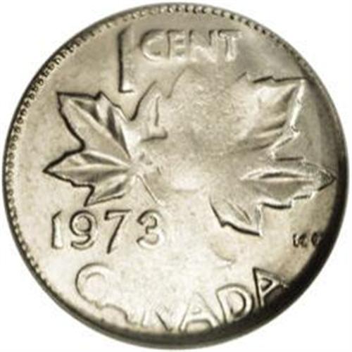 <B>Elizabeth II Cent 1973 struck on a 10 Cents planchet,</B></I> 2.1 grams, MS64 NGC. A very scarce and popular multi-metal mint error.<BR><I>From the Dominion Collection.</B></I>
