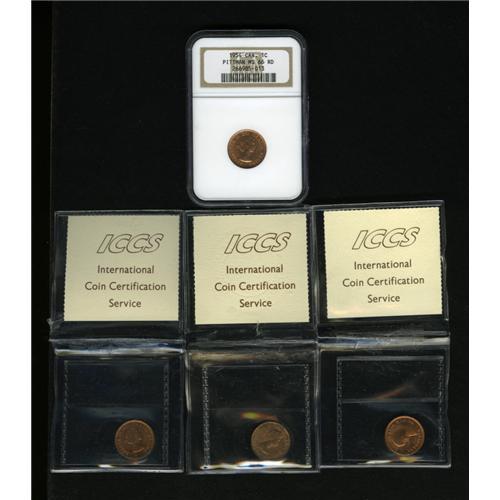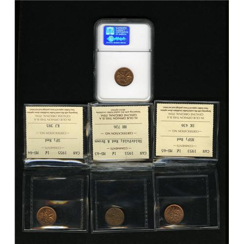 <B>Elizabeth II Cents - Four Early Dates, </B></I>KM49 1953 NSF MS65 RED ICCS, 1953 SF MS63 RB ICCS, 1954 SF MS66 RD NGC Pittman and 1955 SF MS64 RED ICCS.<BR><I>From the Dominion Collection.</B></I><BR><BR><b>Shipping:</b> Coin/Currency (<a target="_blank" href="http://www.heritageauctions.com/common/shipping.php">view shipping information</a>)