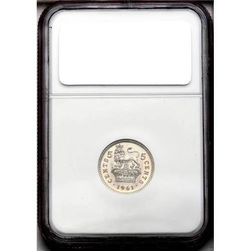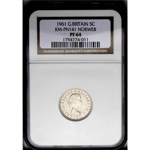 <B>Elizabeth II Decimal pattern 5 Cents, 1961. </B></I>KM-PN141. PF64 NGC Norweb. Extremely rare. Obverse bears the familiar portrait seen on sixpence coins of the same year. Reverse shows a lion atop a crown, surrounded by the curious denomination, twice, and the date below. This is reminiscent of the Decimal patterns of almost exactly 100 years prior to this coin's creation (see the 1859 pattern halfpenny, P-2037, also in this sale, for comparison). Very choice with bright, delicately toned surfaces and a very bold strike. A modern rarity that is far from fully recognized, perhaps to be put away until the reign ends.