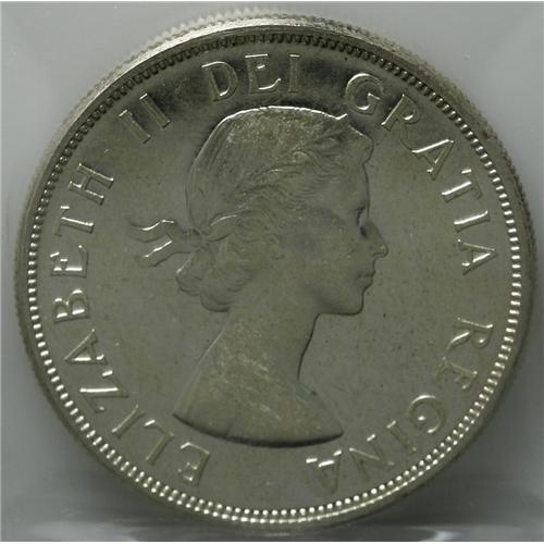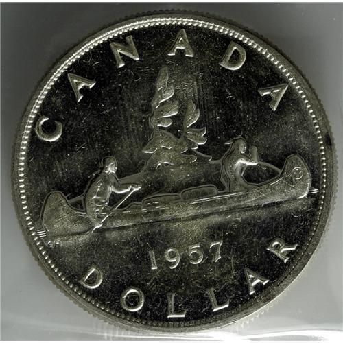 <B>Elizabeth II Dollar 1957 - Two Varieties, </B></I>KM54, MS63 ICCS 1 Waterline and PL65 Cameo ICCS.<BR><I>From the Dominion Collection.</B></I>