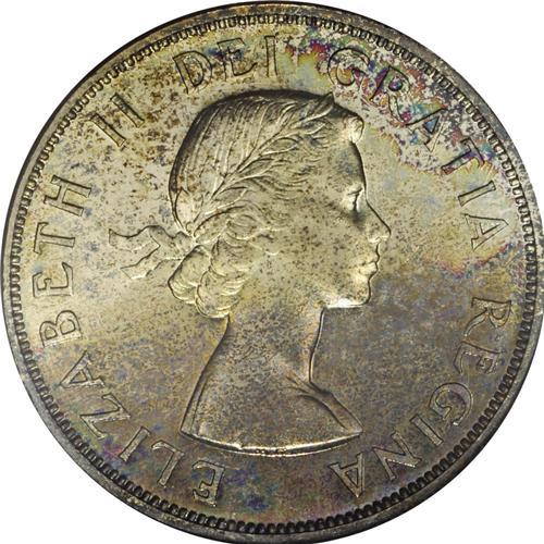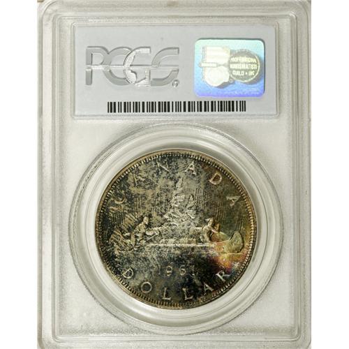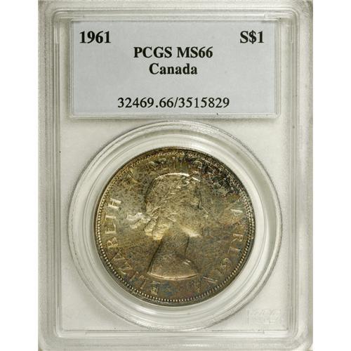 <B>Elizabeth II Dollar 1961, </B></I>KM54, MS66 PCGS, a superb coin with multi-hued patina. Rare in this grade with only 3 examples certified as MS66 by PCGS and none higher!<BR><BR><b>Shipping:</b> Coin/Currency (<a target="_blank" href="http://www.heritageauctions.com/common/shipping.php">view shipping information</a>)